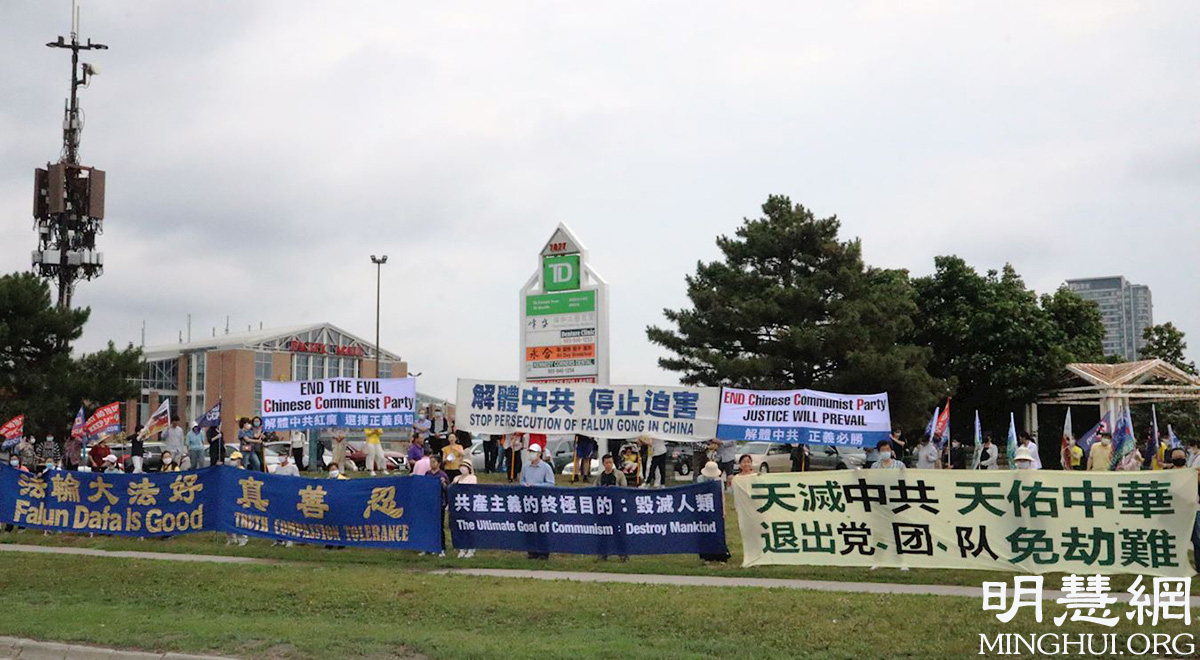 图1:二零二一年六月二十六日中午,多伦多部份法轮功学员在万锦市的太古广场,举行了“解体中共,结束迫害”的集会。