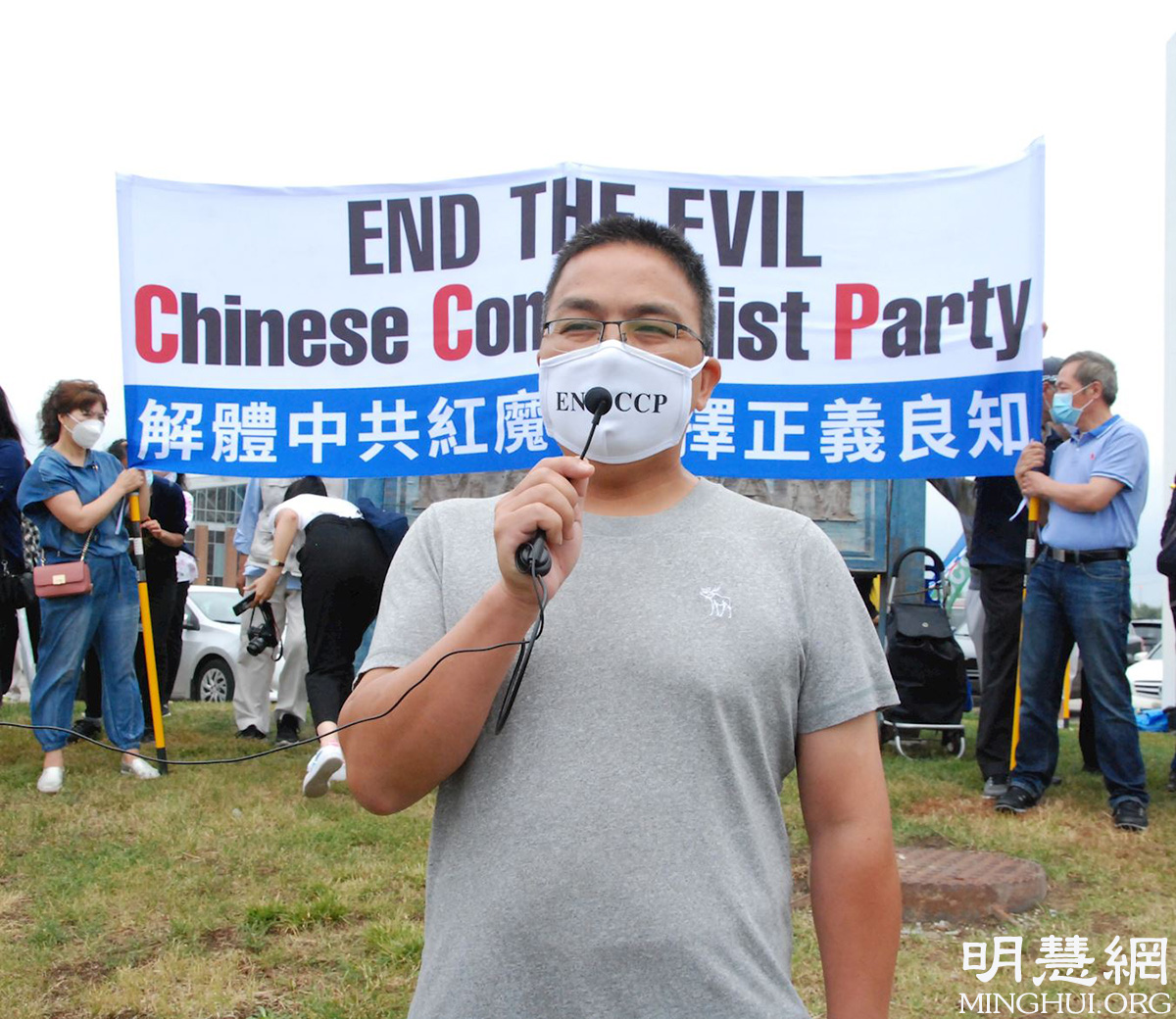 疫情以来一直在给海内外的中国人讲真相的法轮功学员刘女士在集会上说,中国人的出路有两点:1.选择“三:退.”(退出中共党、团、队组织);2.真心念真言(法轮大法好,真善忍好)。