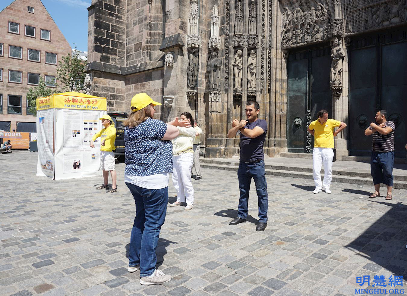 ![]() 图2:二零二一年六月三日,法轮功学员在德国纽伦堡市的洛伦兹教堂前举行信息日,两位乌兹别克斯坦游客当场学习法轮功功法。 |