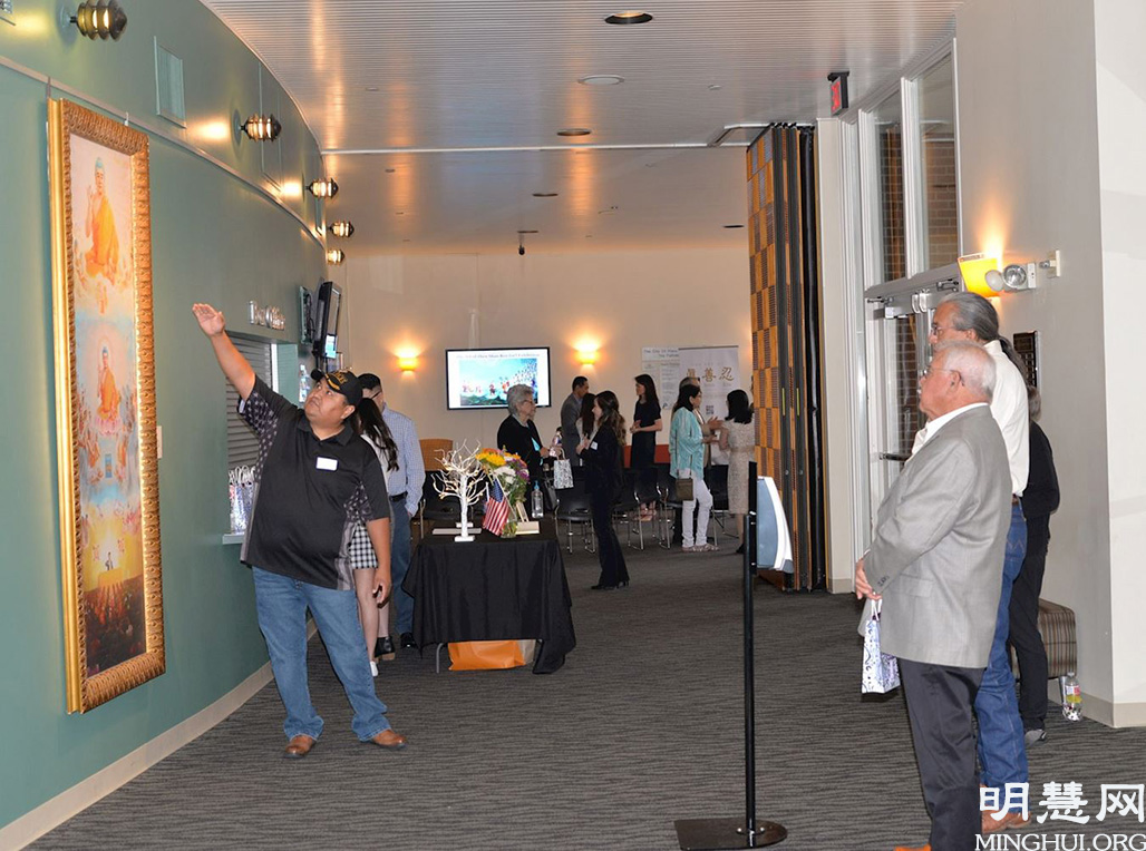 【明慧网二零二一年六月九日】(明慧记者曾洪达拉斯报道)二零二一年六月二日至七月二日,美南大法学会在美国德州布兰诺市(City of Plano)中心的Courtyard 剧院举办为期一个月的“真善忍国际美展”。六月二日晚,主办方在剧院举办招待会拉开了美展的序幕,多名政要、社区领袖前来观看了画展,他们被艺术作品中所展现出的美好、正义和对信仰的坚定所感动。