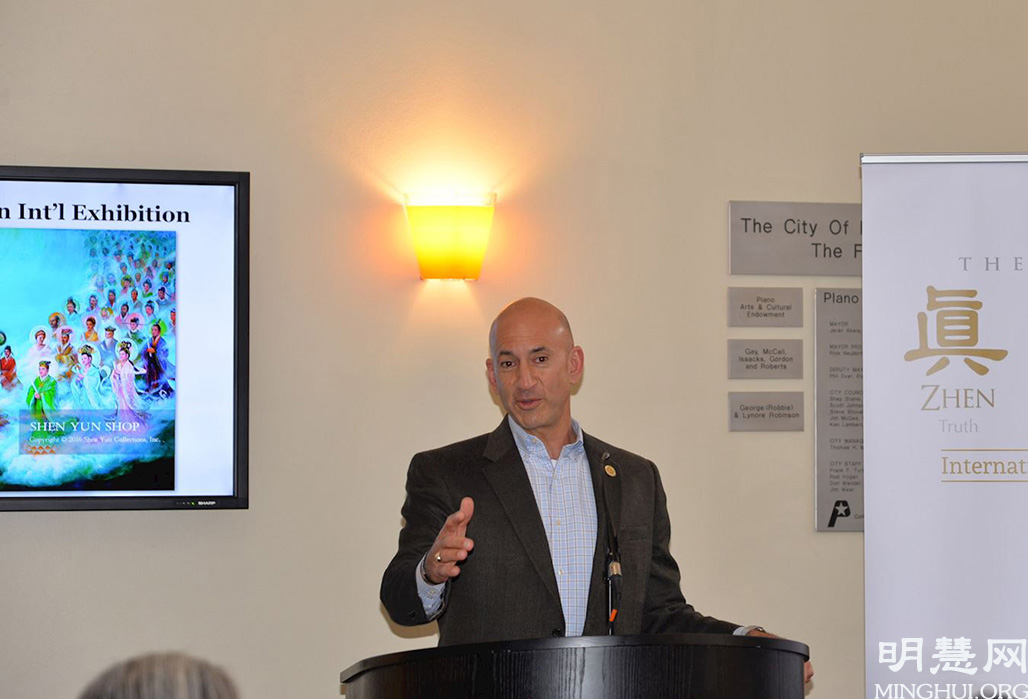 图5:布兰诺市市议员Maria Tu欢迎真善忍美展