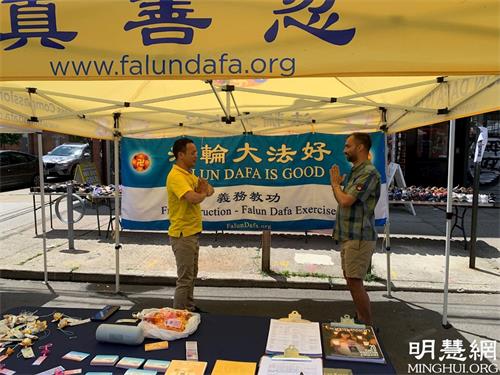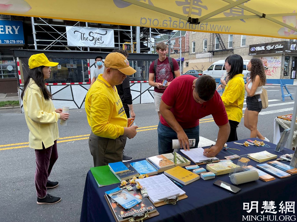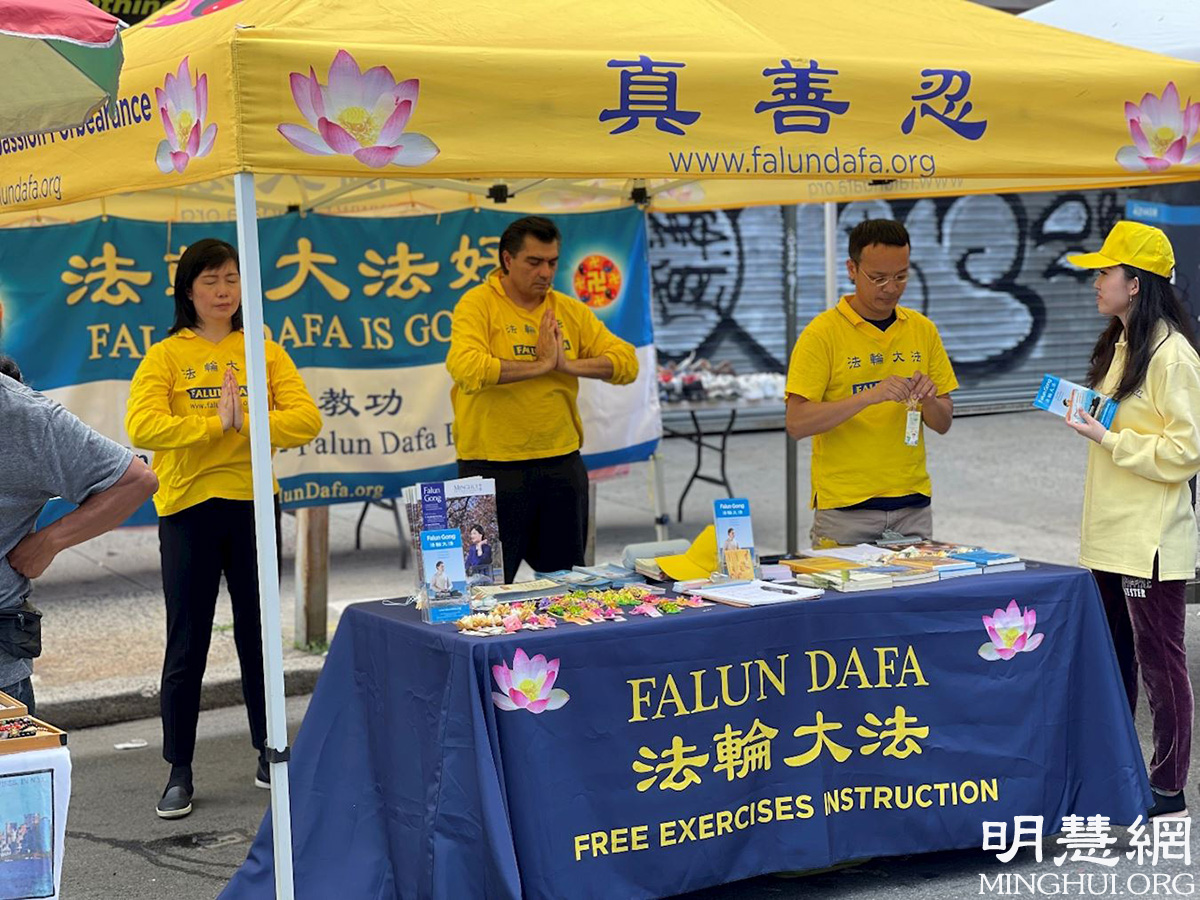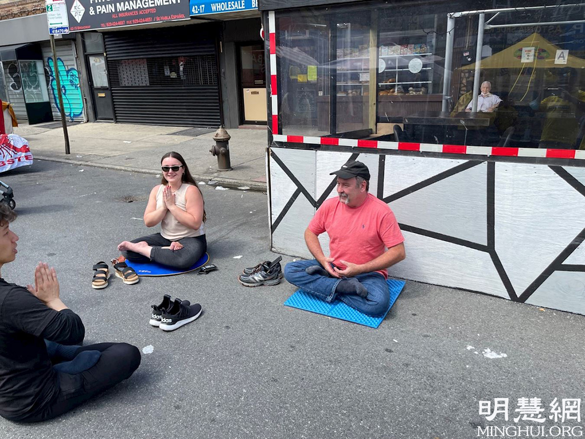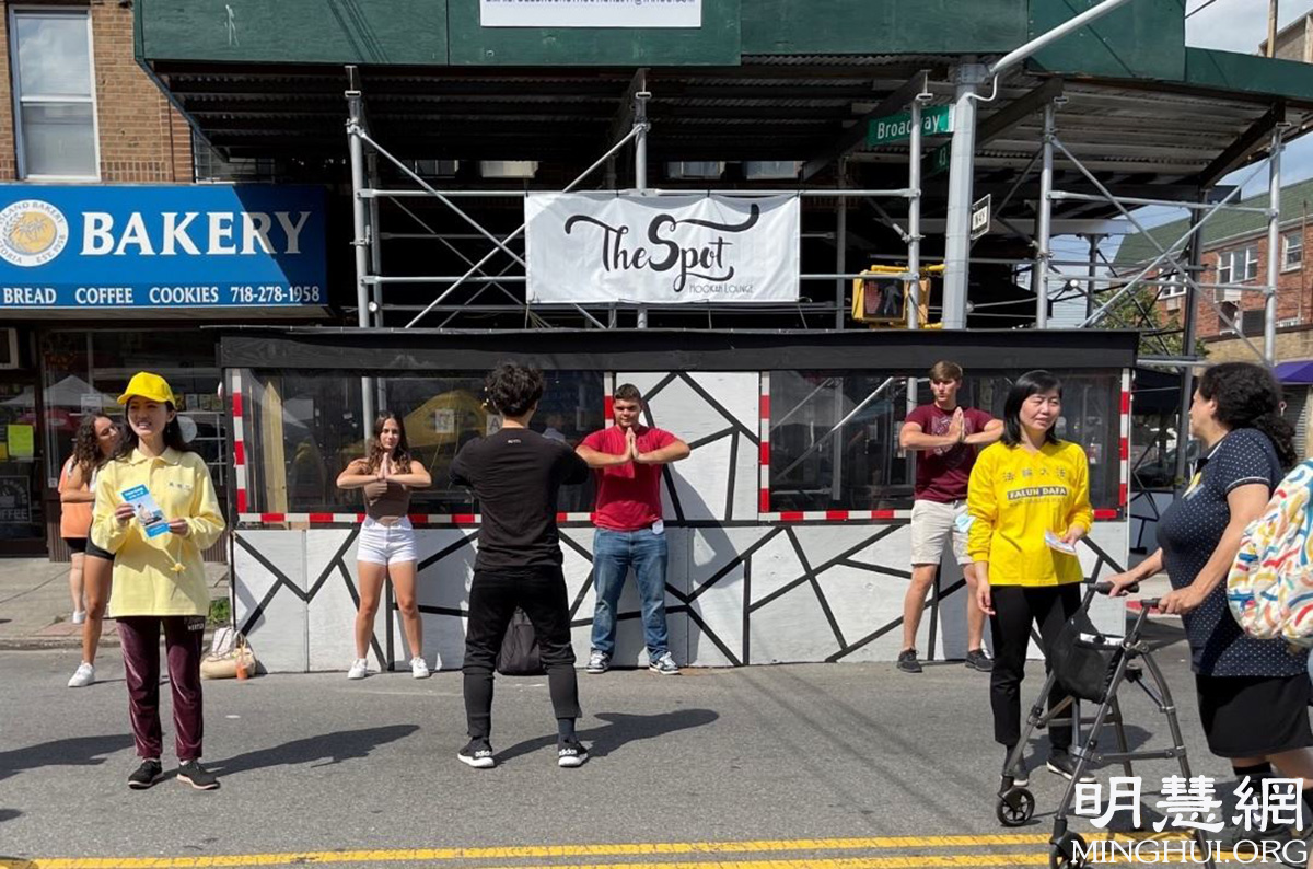 早上10点,法轮功学员便来到阿斯托利亚43街和Broadway的活动地点支起帐篷,播放起舒缓的炼功音乐,展示祥和的五套功法,并为有缘人送出手工折叠的小莲花和小册子。很多当地居民来到展位详细了解法轮功,并现场学习起了五套功法。