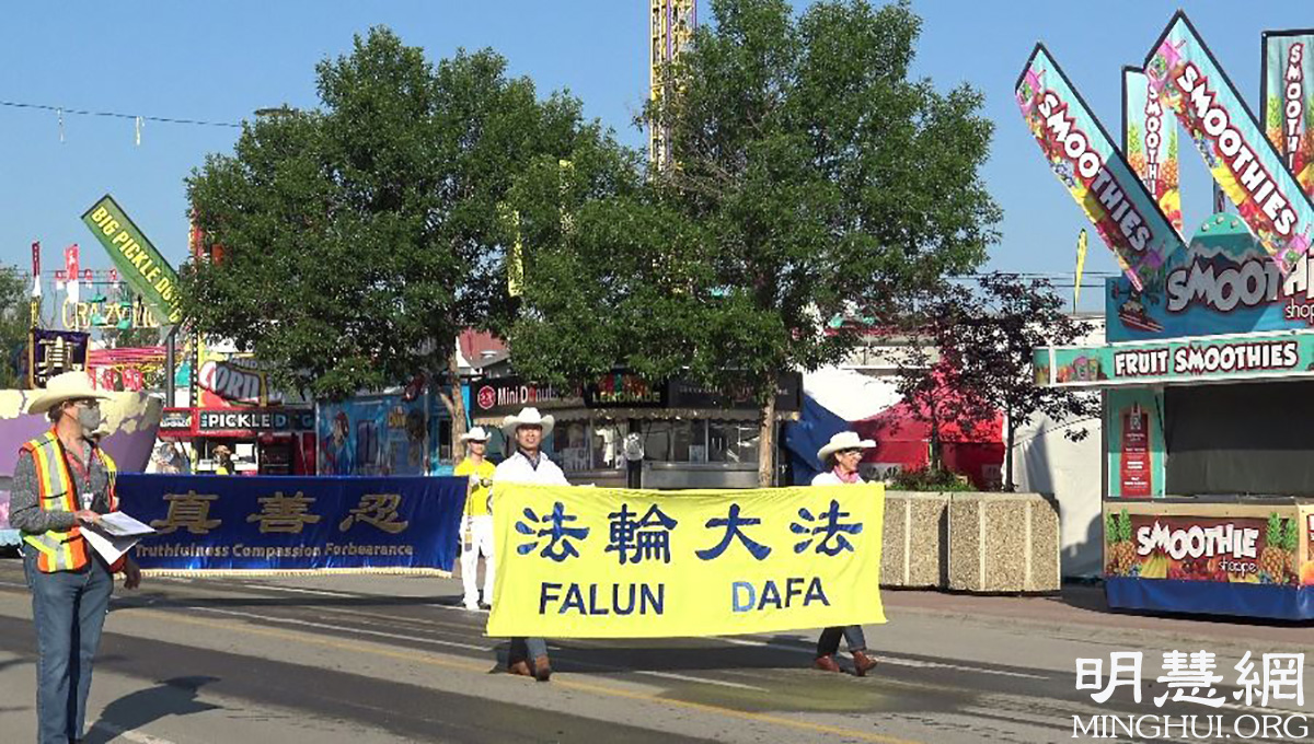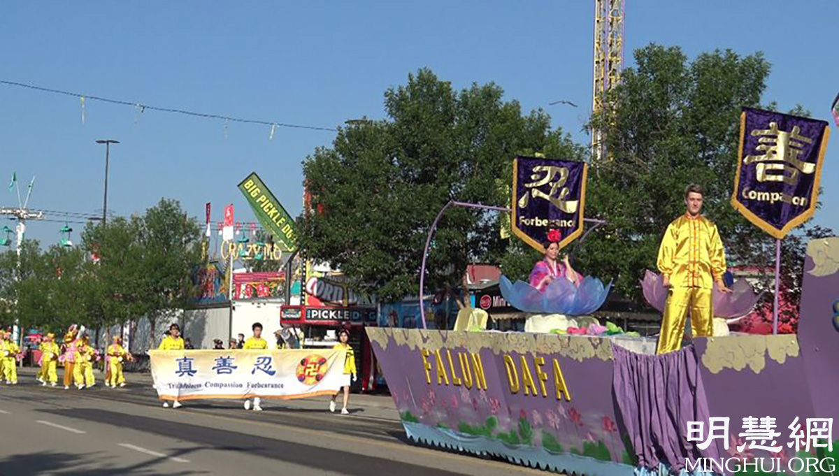 直播主持人对法轮功团队赞不绝口,她说:“这辆花车太引人注目了!每个人都注意到它,花车太漂亮了。你看,花朵盛开,你难道不喜欢从一朵花中绽放出来吗?花车如此巨大,这里有不寻常的美丽!法轮大法是传统的中国打坐修炼,修炼者遍及世界各地包括卡尔加里,舒缓的炼功,能改善健康和提升人的悟性。你听到鼓声了吗?腰鼓队也是法轮大法团队的一部份。腰鼓在中国有上千年的历史,让我们听一下,他们确实不同一般,不是吗?他们的协调性非常好,所有的人都排列整齐,所有的人都踩着节拍,所有的人都明亮喜庆、卓越、极具启示和快乐的,真好!”