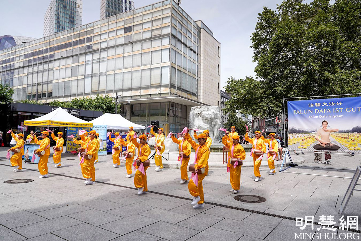 ![]() 图1:腰鼓队在表演“法轮大法好”曲目 |