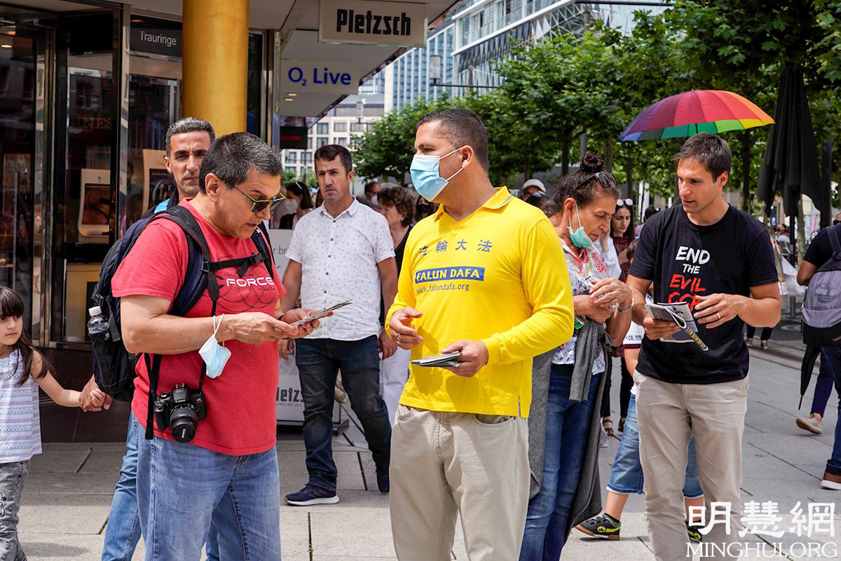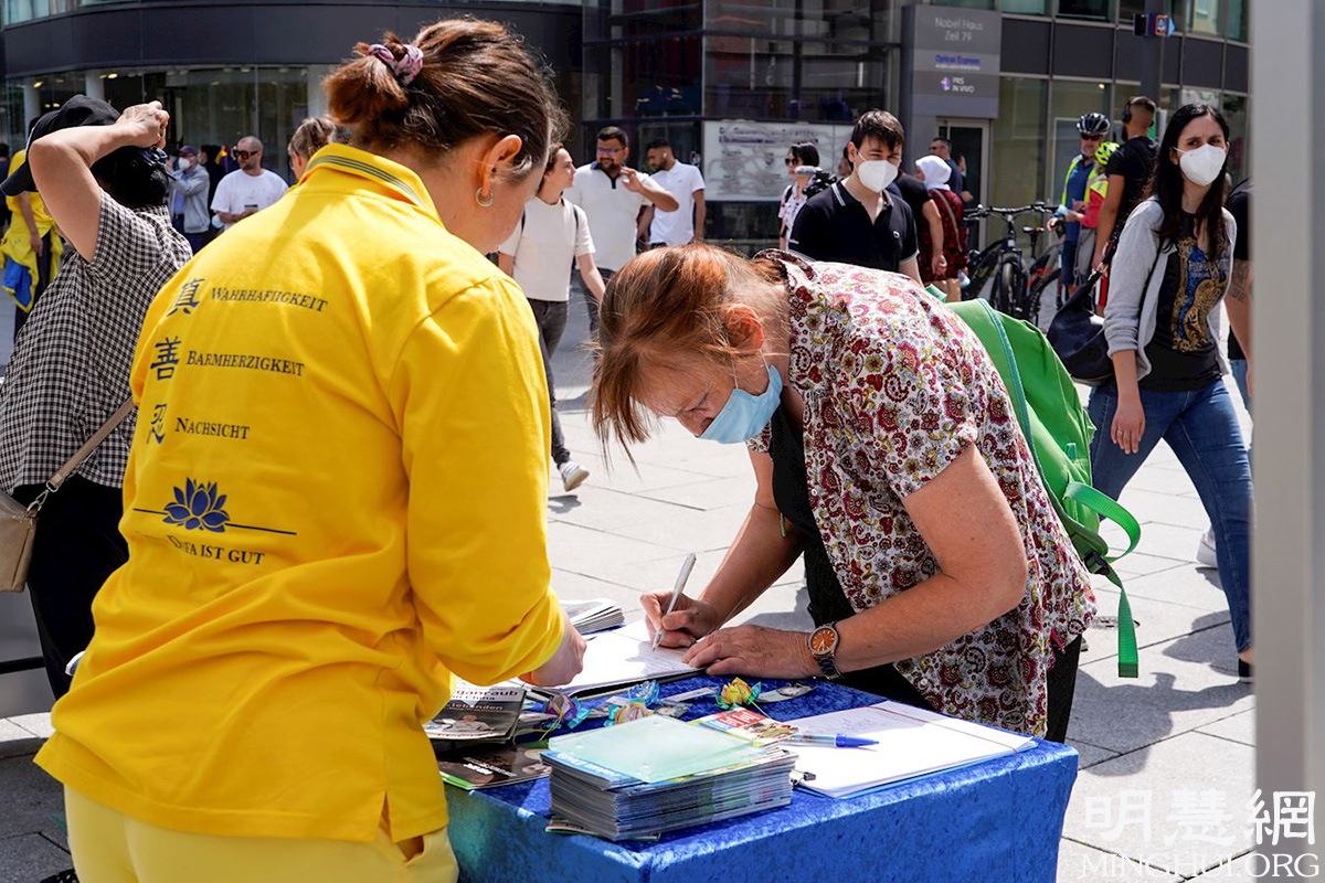 一位德国中年男士对法轮功学员说,“你们做的事很值得,能唤醒人。”他说之前他没听说过法轮功,也不知道中共迫害的事。当他路过此地时,有法轮功学员让他在征签表上签字,并告诉他原因,他对中共的残酷迫害感到很震惊,立即签了名。