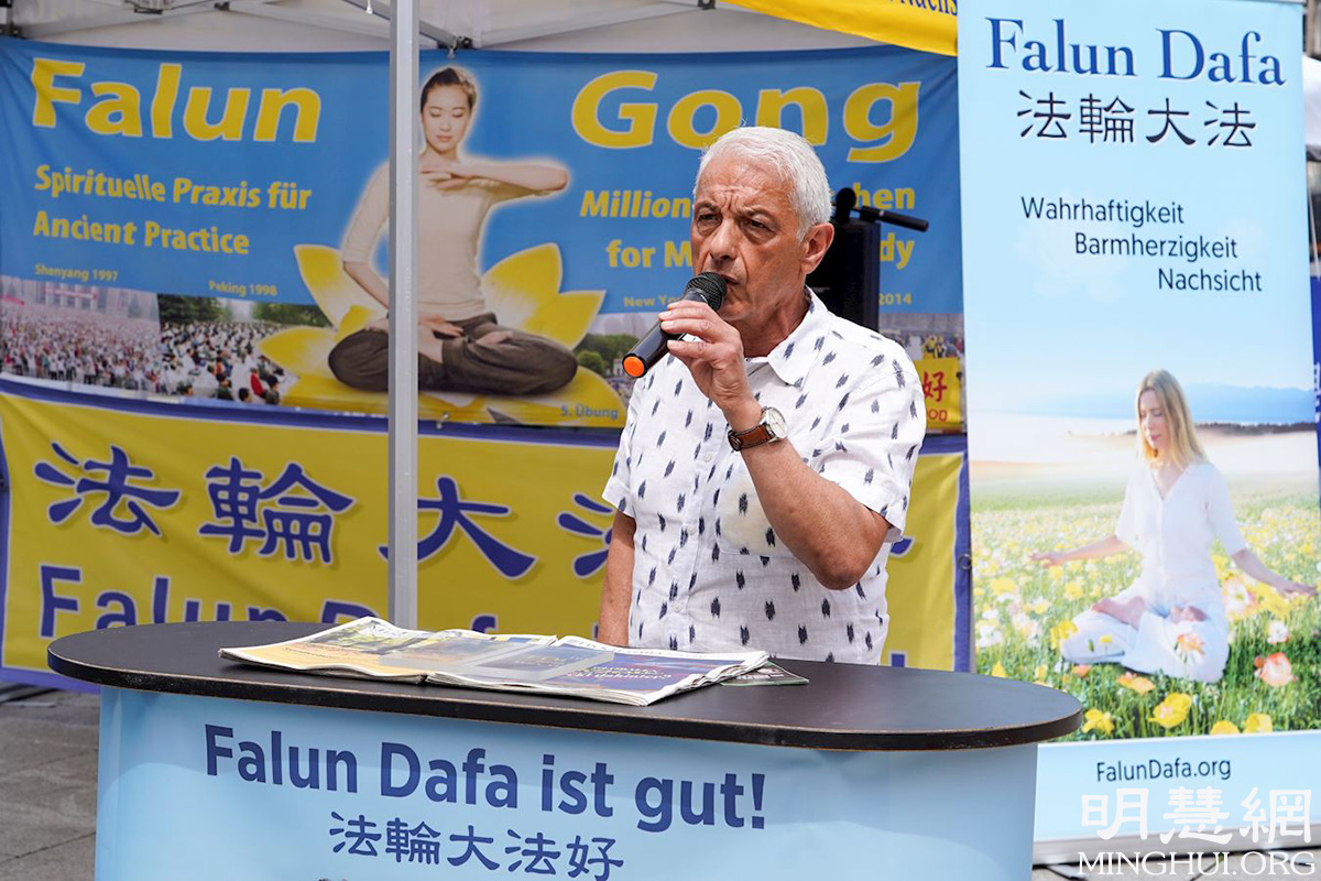 德国国际人权组织的理事、亚洲部负责人胡伯特·科培尔(Hubert Körper)先生在现场发言,谴责中共对法轮功发动至今长达二十二年的残酷迫害,赞扬法轮功学员长期坚持不懈反迫害的义举,并呼吁德国政府为制止中共人权迫害、维护世界和平做出应有的努力。