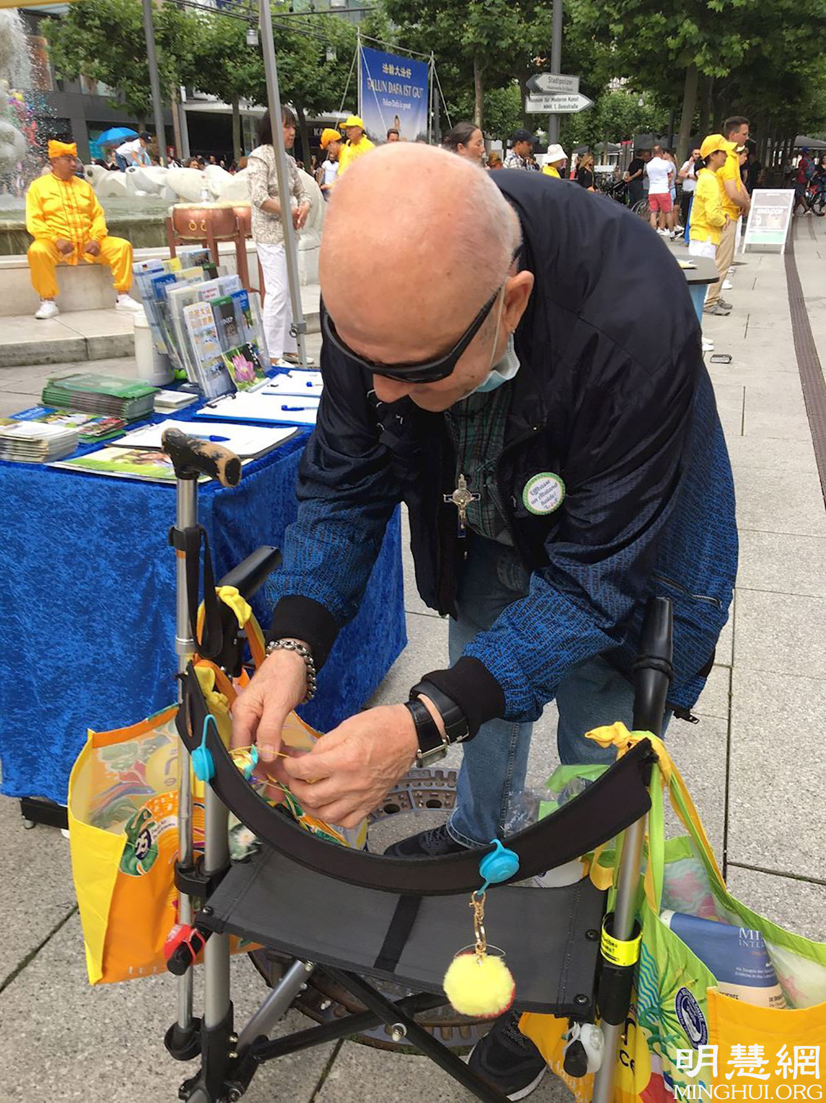 一位老人戴着墨镜,推着小推车来到桌前,拿起一张真相传单几乎贴到眼镜上,边看边对法轮功学员说:“我知道中共迫害法轮功的事、活摘器官的事。我曾经读过这些报导。”老人说,他今年八十三岁,眼睛刚做过手术,还不好使,但他要签名,说着就在表上艰难地签了名。他说他经历过纳粹的黑暗时代,知道什么叫独裁,什么叫痛苦。他对法轮功学员的遭遇深表同情,“我希望早日结束这场迫害,祝你们成功!”