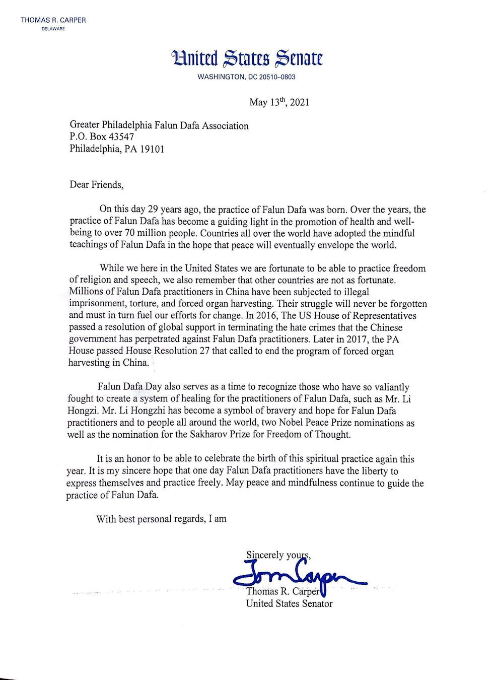 美国特拉华州联邦参议员卡珀(Thomas R. Carper)在贺信中提醒人们,“虽然我们很幸运,在美国能够享有宗教和言论自由,但我们也不能忘记那些不幸的国家。数以百万计的法轮大法修炼者在中国遭到非法关押,酷刑折磨,甚至活摘器官。我们永远也不能忘记他们的遭遇,并要将其化作我们做出改变的动力。”卡珀参议员衷心希望中国大陆的法轮功修炼者能够拥有自由的修炼环境。