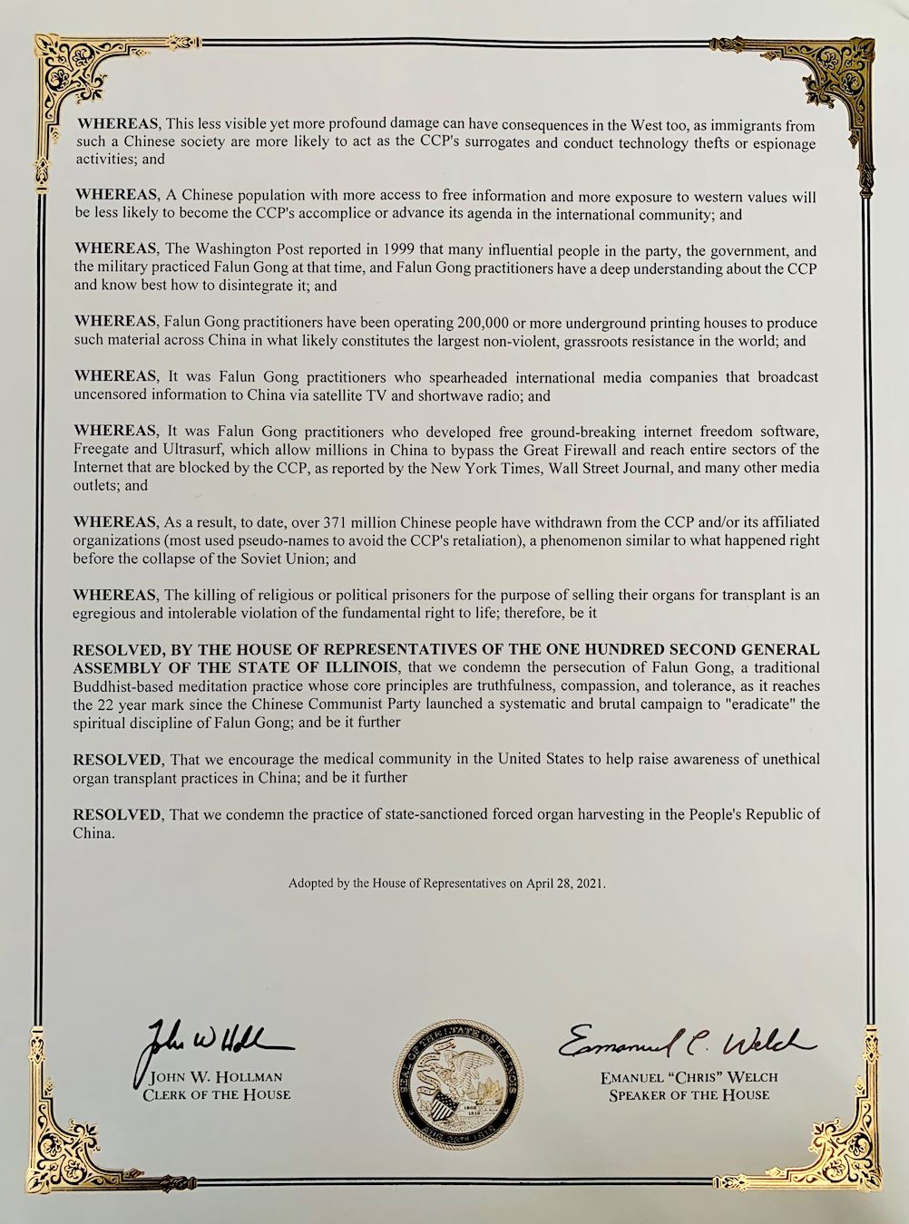 决议案中说:由伊利诺伊州众议院第102届议会决议,在中共发起旨在消灭法轮功的全国性的严重迫害的22周年之际,我们强烈谴责对法轮功的迫害。我们鼓励美国医学界帮助提高人们对在中国进行的不道德器官移植的认识;我们谴责中共在中国进行的国家支持的活摘器官的行径。