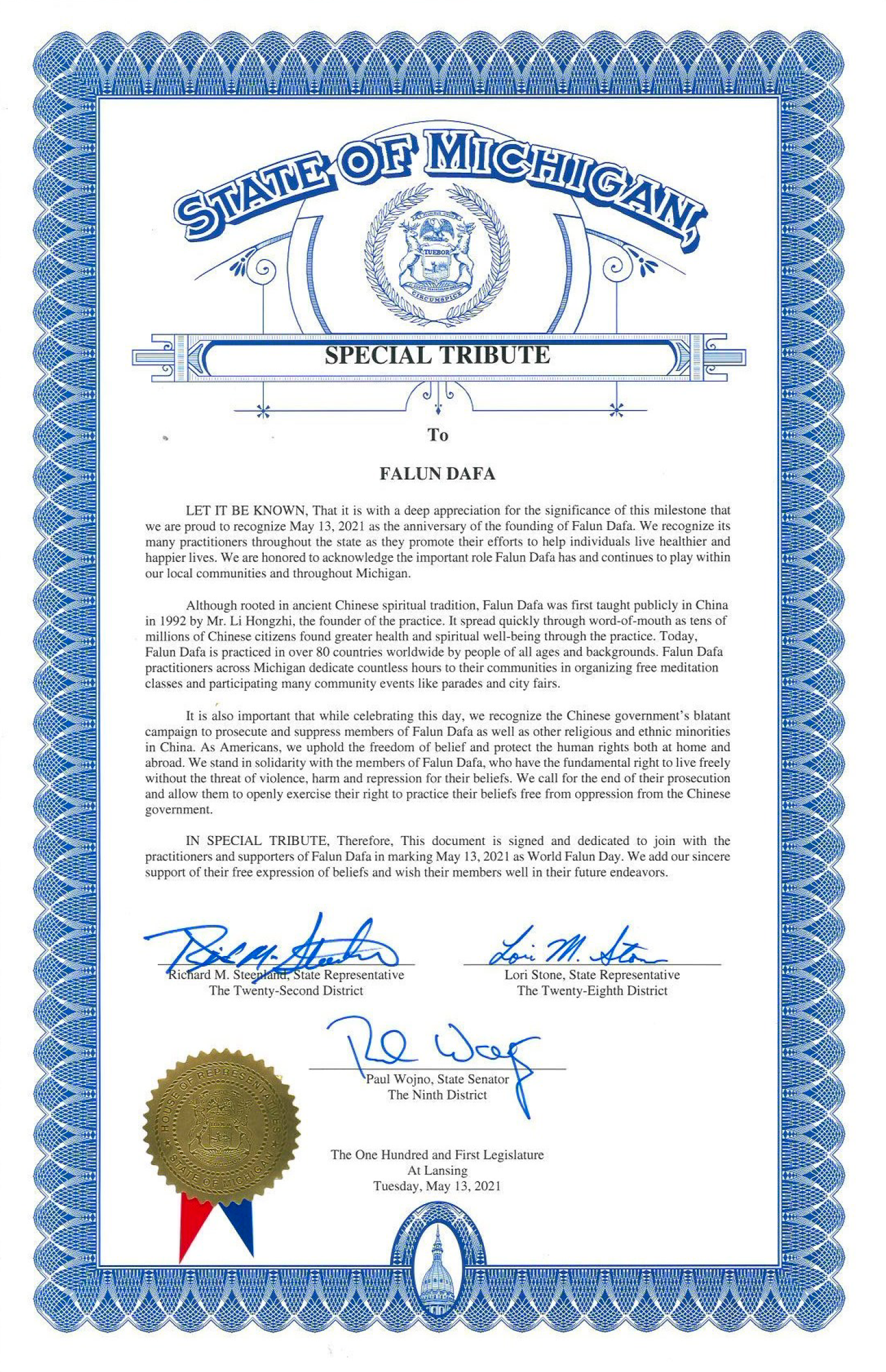二零二一年五月,密西根州第二十二区州众议员理查德·斯蒂恩汉德(Rep. Richard Steeenland)、第二十八区州众议员罗瑞·斯通(Rep. Lori Stone)和第九区州参议员保罗·沃伊诺(Paul Wojno)共同签署了一份特殊褒奖令,褒奖令中还表达了支持法轮功学员的反迫害:“我们与法轮大法修炼者们站在一起,他们有在不受到暴力、伤害和打压威胁的情况下自由生活的权利。我们呼吁结束对他们的迫害和打压,允许他们享有自己的基本权利和自己的信仰。”