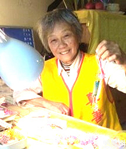 ![]() 图2:每天一早,86岁的法轮功学员黄韵琴就到电视塔前挂横幅,一挂就一大排,迎接中国游客。 |