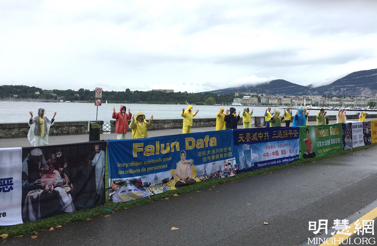 ![]() 图1:二零二一年七月十五日,部份瑞士法语区法轮功学员在七二零前夕,冒雨聚集在日内瓦联合国人权事务高级专员办事处所在地威尔逊宫前,举行反迫害二十二周年纪念活动 |