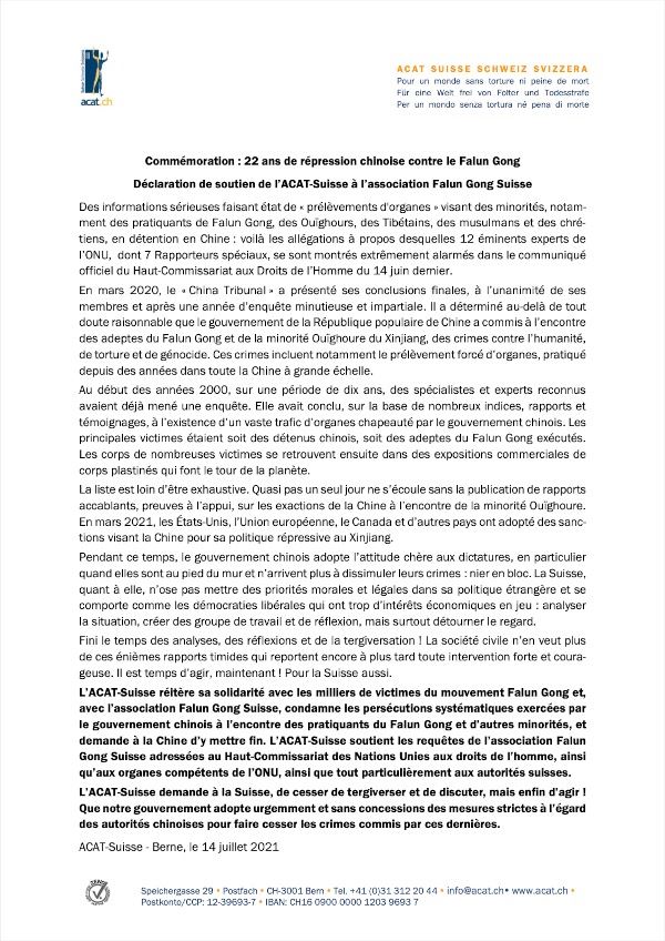 声明中说:“瑞士基督教反酷刑协会重申声援法轮功运动千千万万的受害者,并与瑞士法轮大法学会一起谴责中国政府对法轮功学员和其他少数民族的系统性迫害,要求中国(中共)停止这种迫害。瑞士基督教反酷刑协会支持瑞士法轮大法学会向联合国人权事务高级专员办事处以及联合国相关机构,特别是向瑞士当局提出的请求。瑞士基督教反酷刑协会要求瑞士停止拖延和讨论,而是付诸行动!我们的政府要紧急地、毫不退让地对中国(中共)当局采取严格的措施,以终结他们的罪行。”