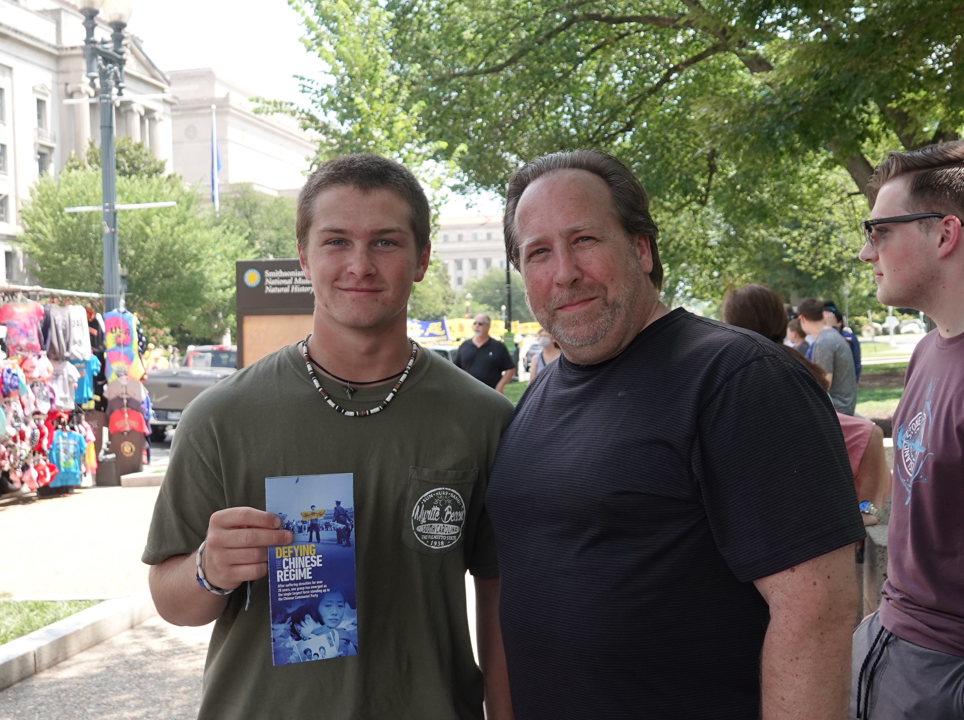 来自弗吉尼亚州南部的拉里(Larry)从法轮功学员手中接过传单。他说这是第一次听说法轮大法。