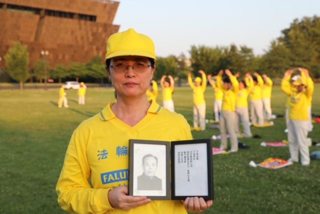 “每年烛光夜悼,我都会带着我父亲的照片。”法轮功学员斯蒂芬妮·张(Stephanie Zhang)眼睛含泪看着父亲的遗像。