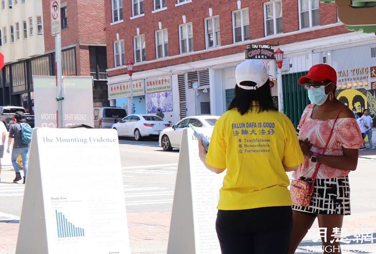 埃普丽尔(April)和先生在远处被学员集体炼功的景象吸引,他们走过来想了解一下。夫妇两人一开始还以为是太极之类的,直到与学员交谈后才知道是法轮功。他们进而也了解到中共迫害法轮功和活摘法轮功学员器官的真相,
