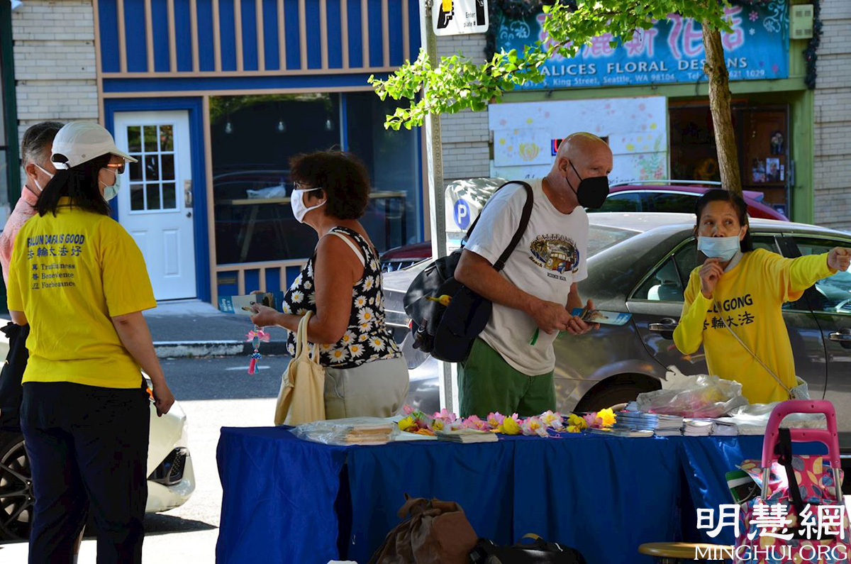 梅兰妮不久前才从密西根州搬到西雅图,她因爱吃中国菜所以就特地来中国城找正宗的中国餐馆,当她路过庆喜公园时被法轮功学员集体炼功的场面吸引,因此好奇地观看法轮功真相展板。