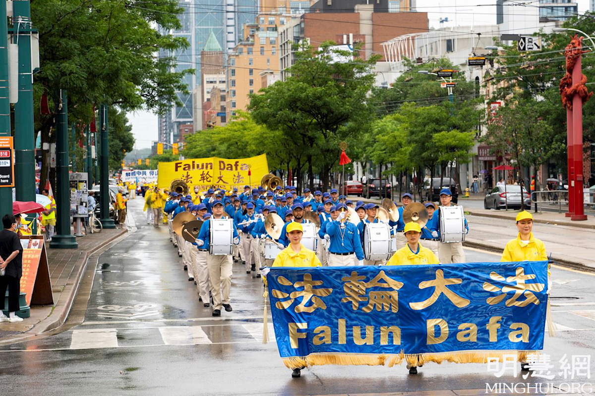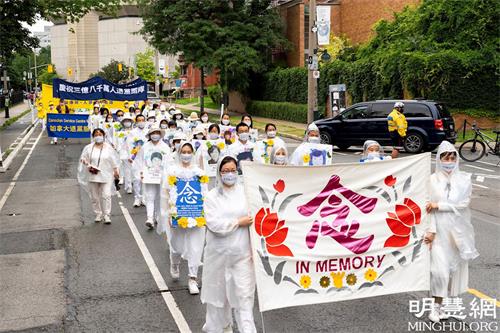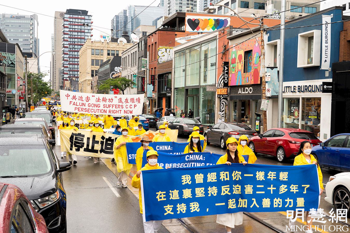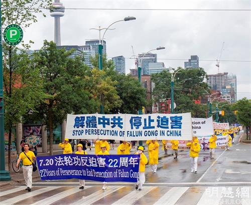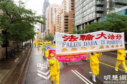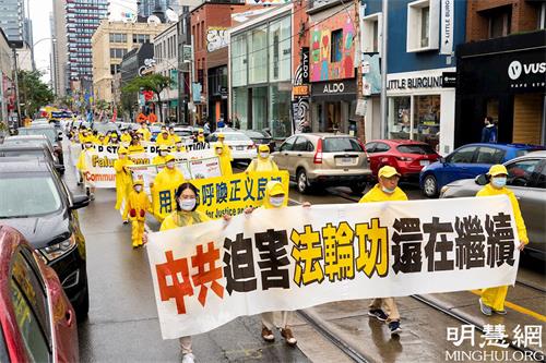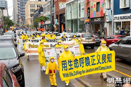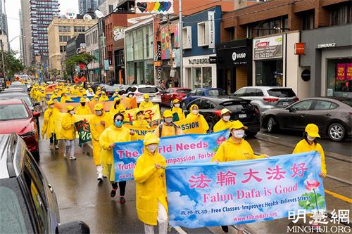 游行队伍从市中心的皇后公园出发,经Bay街,一直往南,经Queen街西行,贯穿中区唐人街的Spadina大道,历时两个多小时。天国乐团打头阵,跟着是“法轮大法好”方阵、停止迫害方阵和“·九·评*”三:退.方阵等几大方阵。