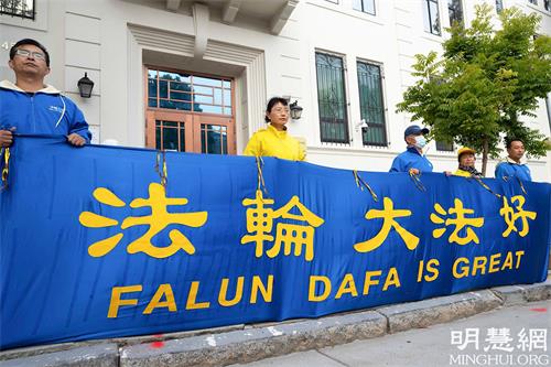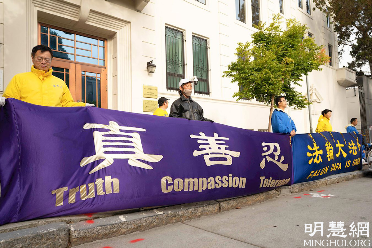 ![]() 图1~9:法轮功学员在中领馆前呼吁解体中共,结束迫害 |