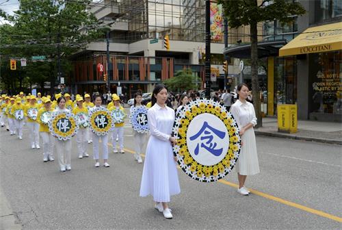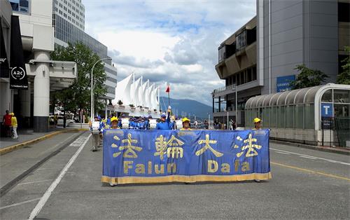 当天下午一时三十分,游行队伍由警车开道,从温哥华艺术馆出发,途经市中心多条繁华街道。天国乐团的演奏吸引了成群的行人驻足观看、拍照、录像。有路人特意走到游行队伍前竖起大拇指,更有司机鸣笛支持。