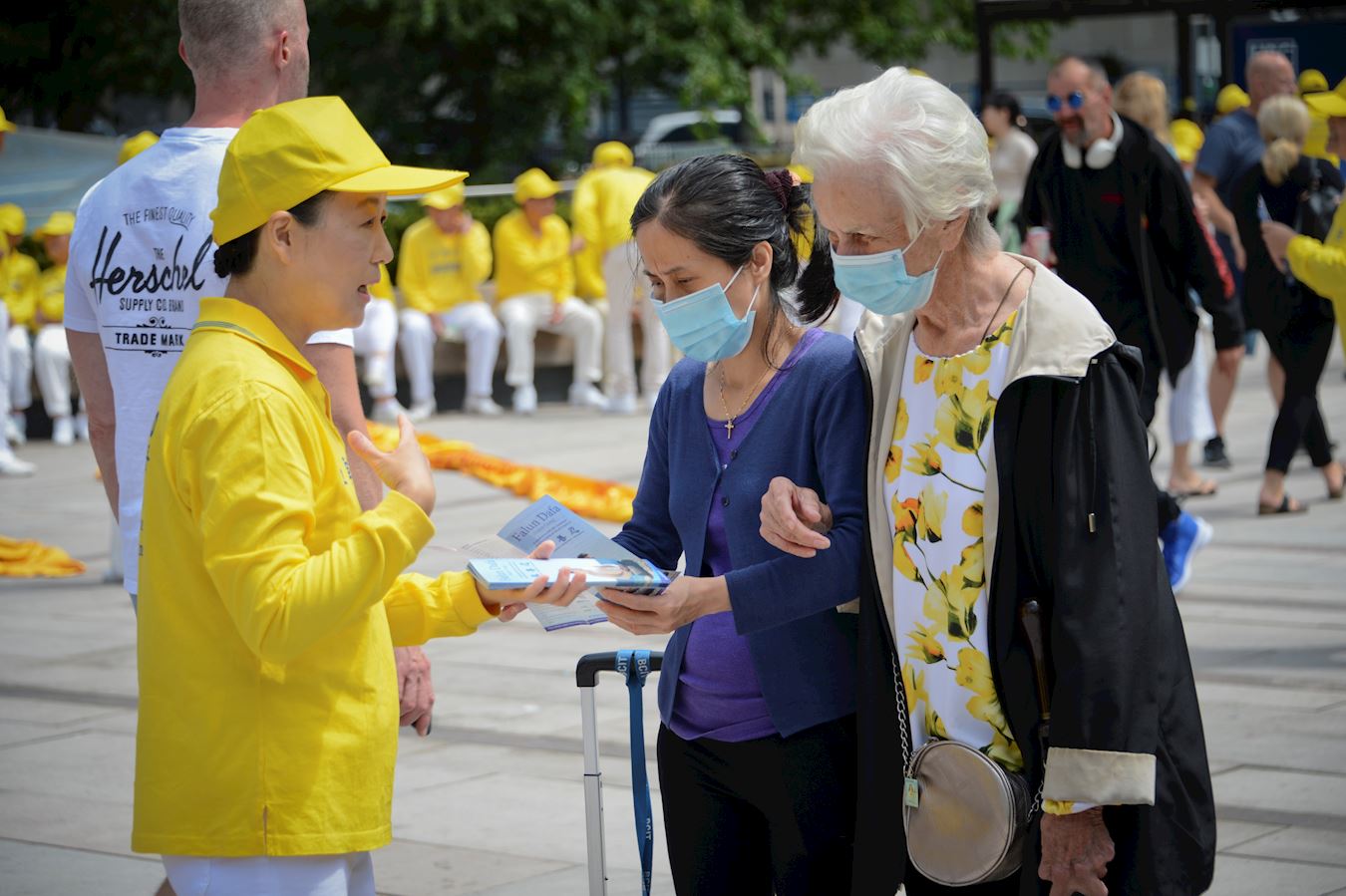 来到集会现场发言的还有一位九十四岁的温哥华居民杜惠卿,她坐在轮椅上呼吁加拿大政府帮助营救她在中国的女儿杨锦妍。二零一九年四月二十一日,杨锦妍在家炼法轮功被不明法轮功真相者告发,广东省中山市警察查抄了她的家,并将她绑架;之后,杨锦妍遭非法起诉,十二月十二日被非法判刑三年,二零二零年底被关进广东省女子监狱。