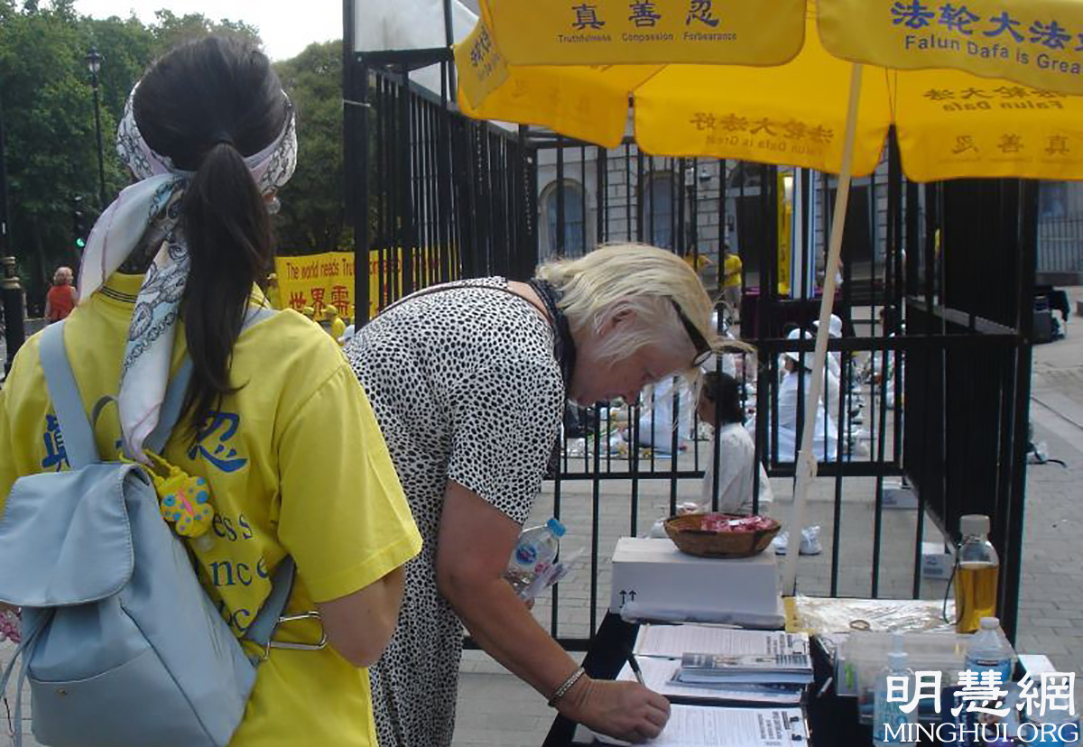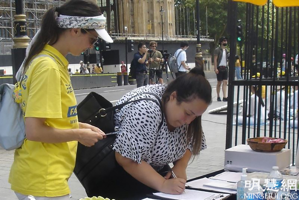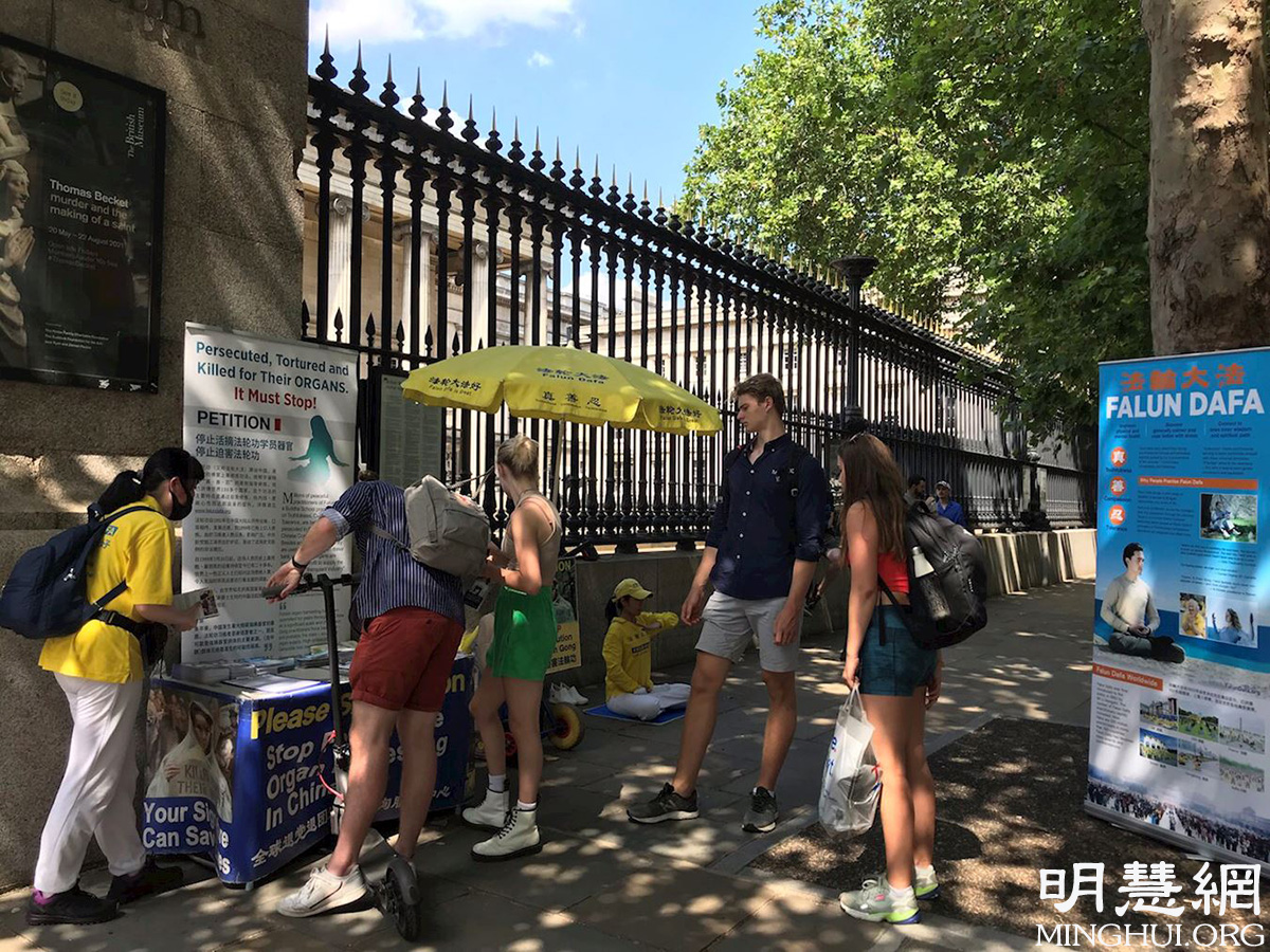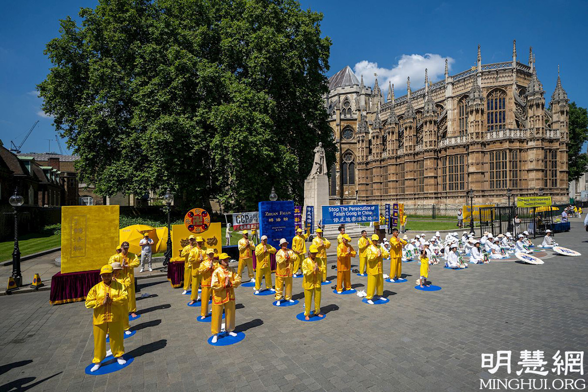 在议会大厦对面,来自英国各地的学员们分别组成炼功的方队、手捧去世学员遗像的方队,手举展牌的方队,和酷刑展示,吸引行人驻足观看,络绎不绝的行人来了解情况,并在征签表上签名。