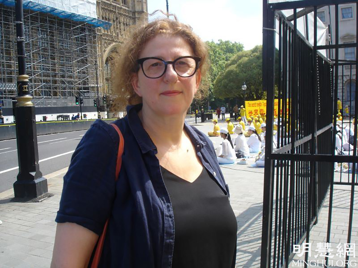 玛丽·凯娜(Mary Kaina)经过时,被深深吸引住了,她立刻举起手机拍起法轮功学员炼功的视频,拍完前面又绕到后面,当一个学员走近她时,她没有放下手机,一边拍着一边问了很多问题:“请给我解释一下好吗?什么是法轮功?”“中共为什么迫害法轮功?”“法轮功是政治团体吗?”“真、善、忍是很好的原则,但做起来并不容易,你们是怎么做的?”