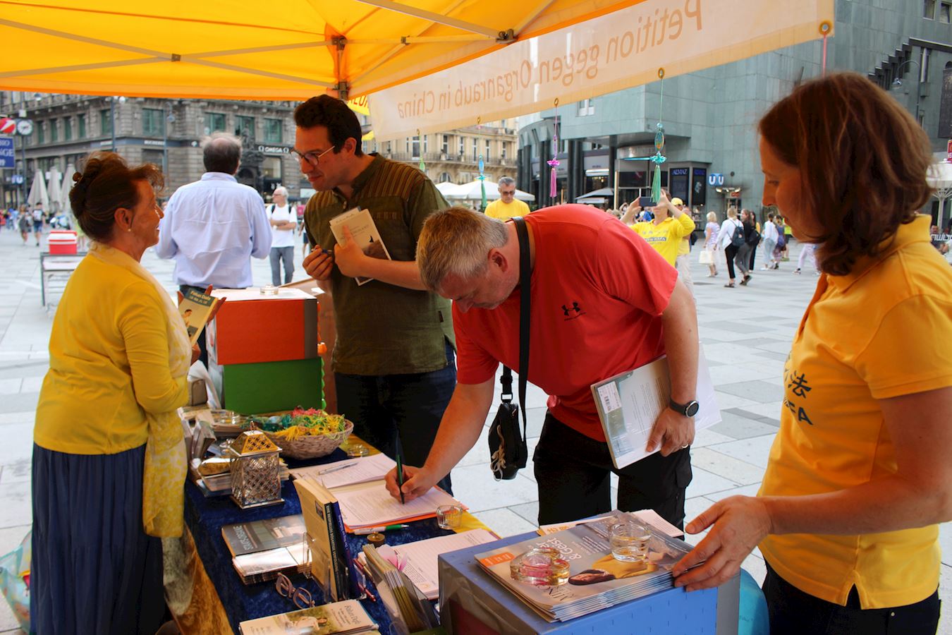 知道真相的民众在信息展台前的征签表格上签字,帮助制止迫害。对中共迫害法轮功的罪恶表示谴责。同时也被学员功法演示所吸引,纷纷拍照留念。