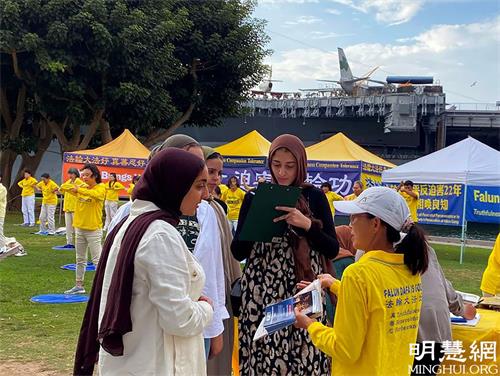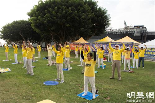![]() 图1~3:加州圣地亚哥法轮功学员在当地著名景点中途岛航母博物馆附近举行集体炼功 |