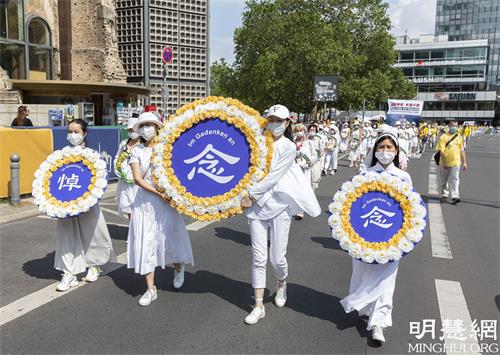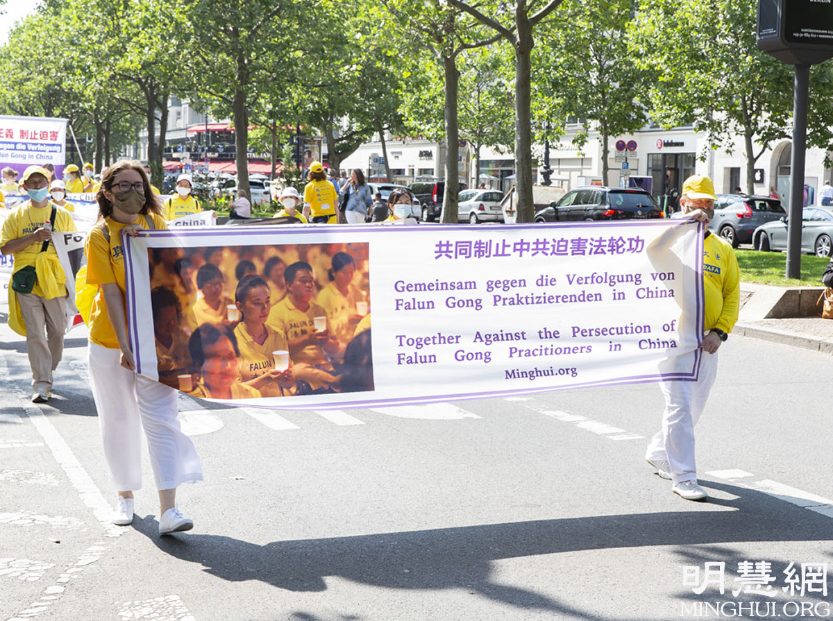 帕兹看到的是德国和瑞士法轮功学员二零二一年七月十七日在首都柏林的游行。随着悠扬的音乐,在游行队伍最前面的是写有“法轮大法”四个大字的横幅,随后是在行进中展示舒缓功法的炼功方阵。紧随其后的亮眼的旌旗及横幅告诉人们法轮大法弘传世界。随即是一群身着白衣的肃穆的女士,每个人的手里都拿着一张配有花圈的被迫害致死的法轮功学员的照片。“活摘器官,天理不容”的大横幅及其之后揭露中共迫害法轮功罪行的展板横幅告诉路人照片中的人们为何会失去生命。“伸张正义,制止迫害”及众多的SOS展板呼吁民众共同制止中共的迫害。在队伍的最后是节奏明快,铿锵有力,身着金色服装亮丽的腰鼓队。