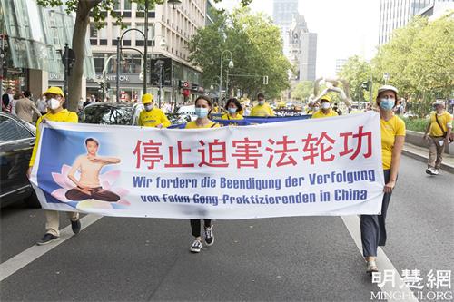 ![]() 图1~2:七月十七日法轮功学员在柏林街头游行,展示功法,告诉路人法轮大法好 |