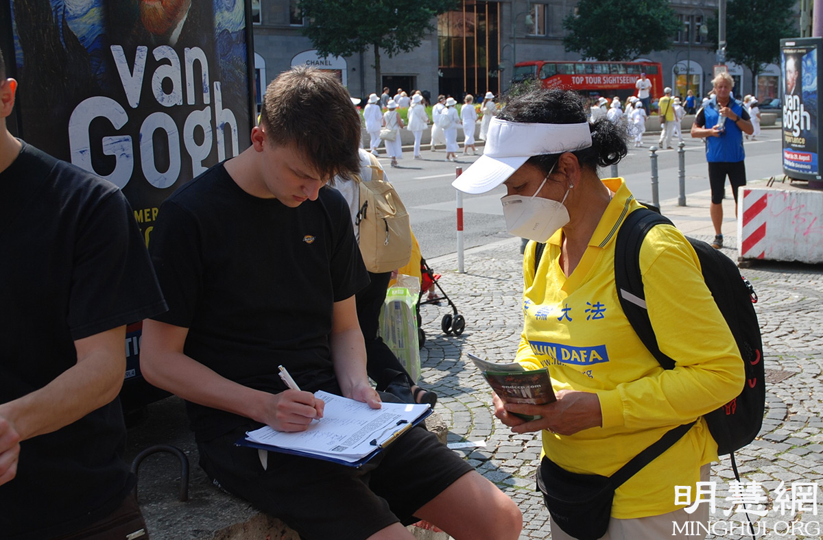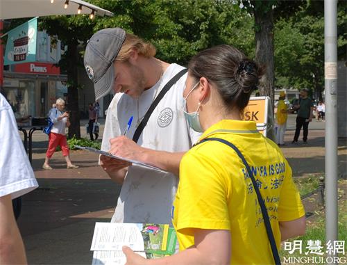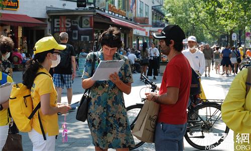 游行队伍中明亮的色彩让从业三十多年的护士希尔克·柏耶弗斯(Sylke Beilfuss)在路边停留,看到横幅上的内容,她立即上网查询,迫害法轮功是怎么回事。了解到的讯息引起了她的关注,她想知道如何能为制止迫害做点什么,她也阅读了学员送上的真相资料,并打算回去后了解更多的讯息。