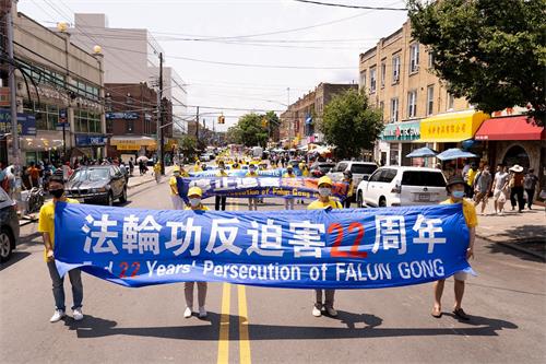 当天的游行,有法轮功支持者跟随队伍走完全程。