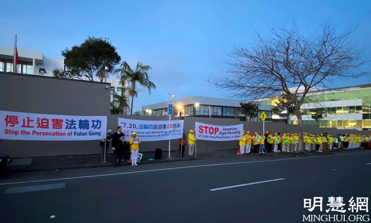 夜幕降临,法轮功学员们手捧遗像,燃起的盏盏烛光仿佛在向人们倾诉着在中国发生的惊天地、泣鬼神的故事,那是信仰真、善、忍的法轮功学员,用生命谱写的壮丽篇章;那是正与邪在人间的较量;那是未来人的传奇故事。过往的车辆络绎不绝,此起彼伏的鸣笛声表达了新西兰人们的敬意和祝福。
