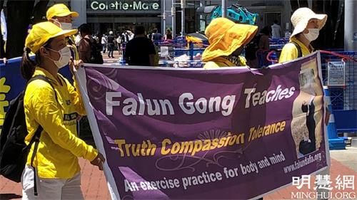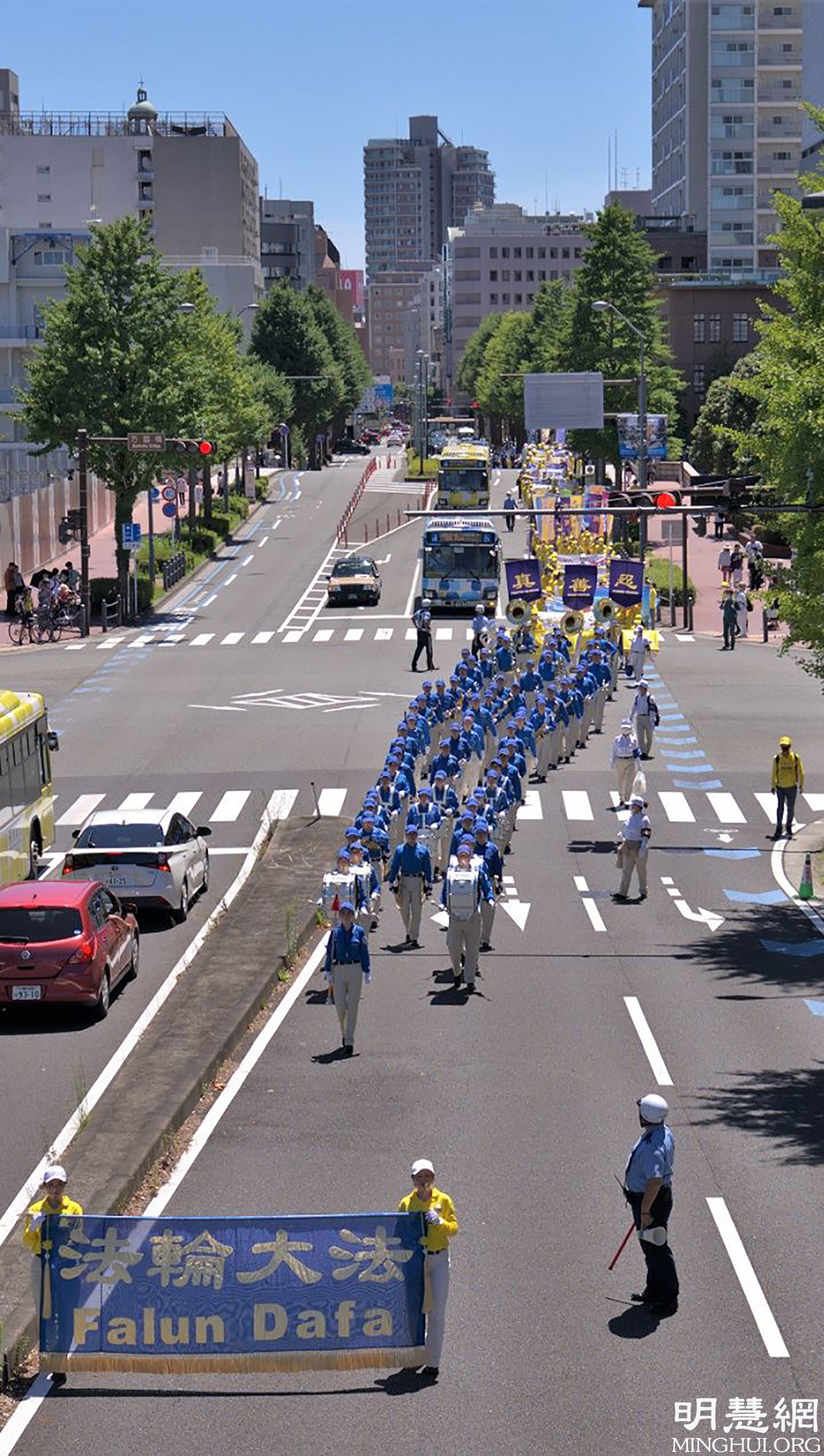 游行队伍从樱木町车站前的广场出发,历时两个小时。在天国乐团的引领下,沿着横滨市内的繁华街道行进。法轮功学员打出的横幅和旗帜上面写着“法轮大法好”、“法轮大法洪传全世界一百多个国家”、“打倒中共恶魔”、“中共≠中国”、“3亿8千万中国人退出中共党团队组织”等内容。