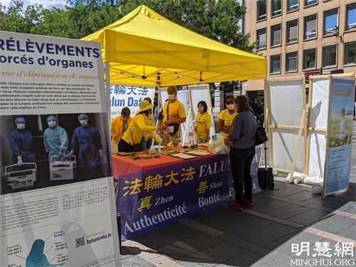 法轮功学员集会的当天,正赶上法国民众上街抗议法国总统所说的将要出台强行疫苗通行证,大量的人流汇集到法轮功学员面前,纷纷拿取真相资料,当日发出去的资料超过了以往任何日子。