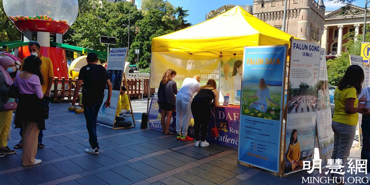 亮眼的展台和功法展示非常受游客欢迎。在此度假的游客和当地居民震惊地得知这种和平的功法在中国受到了残酷的迫害,并主动地在征签表上签名。