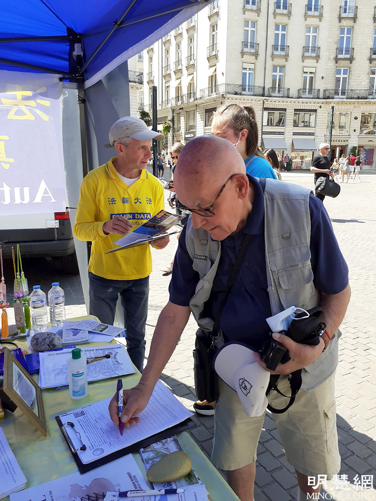 该报道在正文中谈到:“法轮功学员正在法国十个城市共同举行活动,为了让人们了解法轮功学员在中国所遭受的迫害,他们7月17日星期六在南特市皇家广场设立了一个信息展台。”