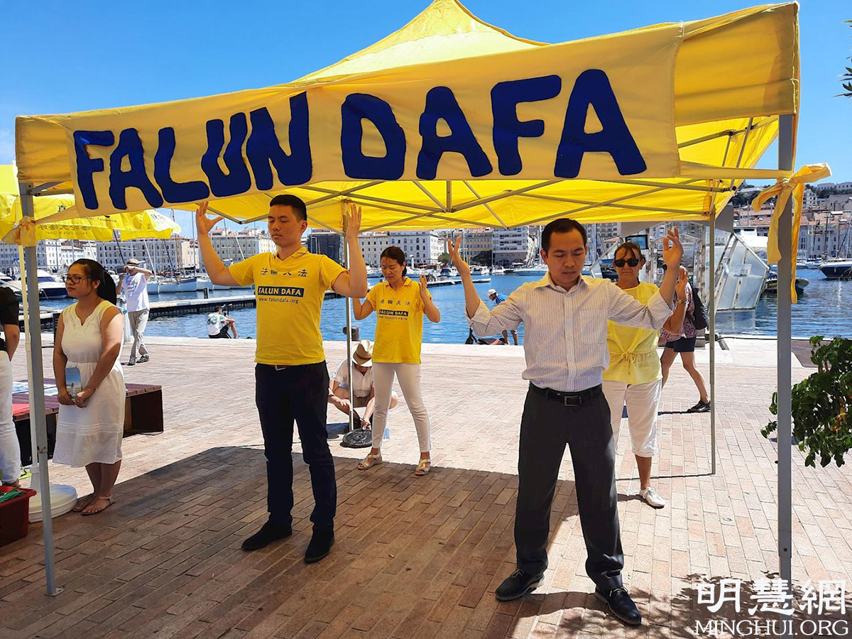 马赛市的部份法轮功学员在老港区市中心(au vieux port)的海滩旁设立了真相展台。部份法轮功学员演示功法,其余的法轮功学员向过往的居民介绍22年反迫害的真相。当天很多人在“停止迫害法轮功”征签表上签名。