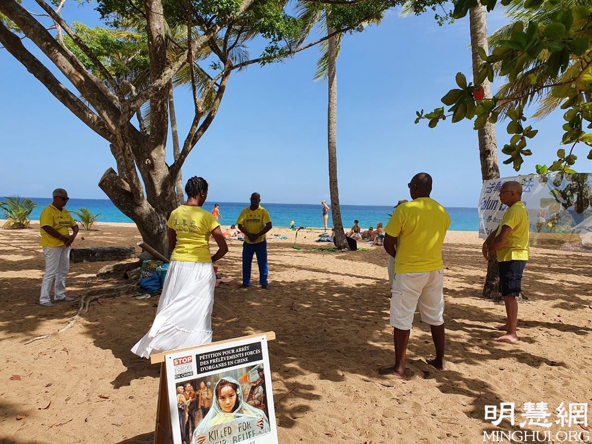 马丁尼克岛距离法国大陆本土的距离大约有7千公里,是法国最远的一个海外省。纪念法轮功反迫害22周年之际,由于当地疫情突变,原申请地被取消了,该地区的法轮功学员选择了在省府所在地的法兰西堡市(Fort De France)的海滩集会。很多居民不仅看到了法轮功的功法展示,也了解到了发生在中国的迫害真相。