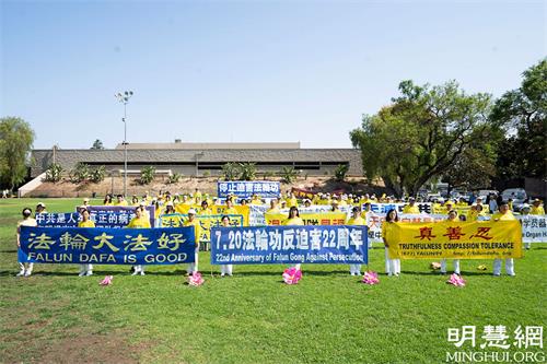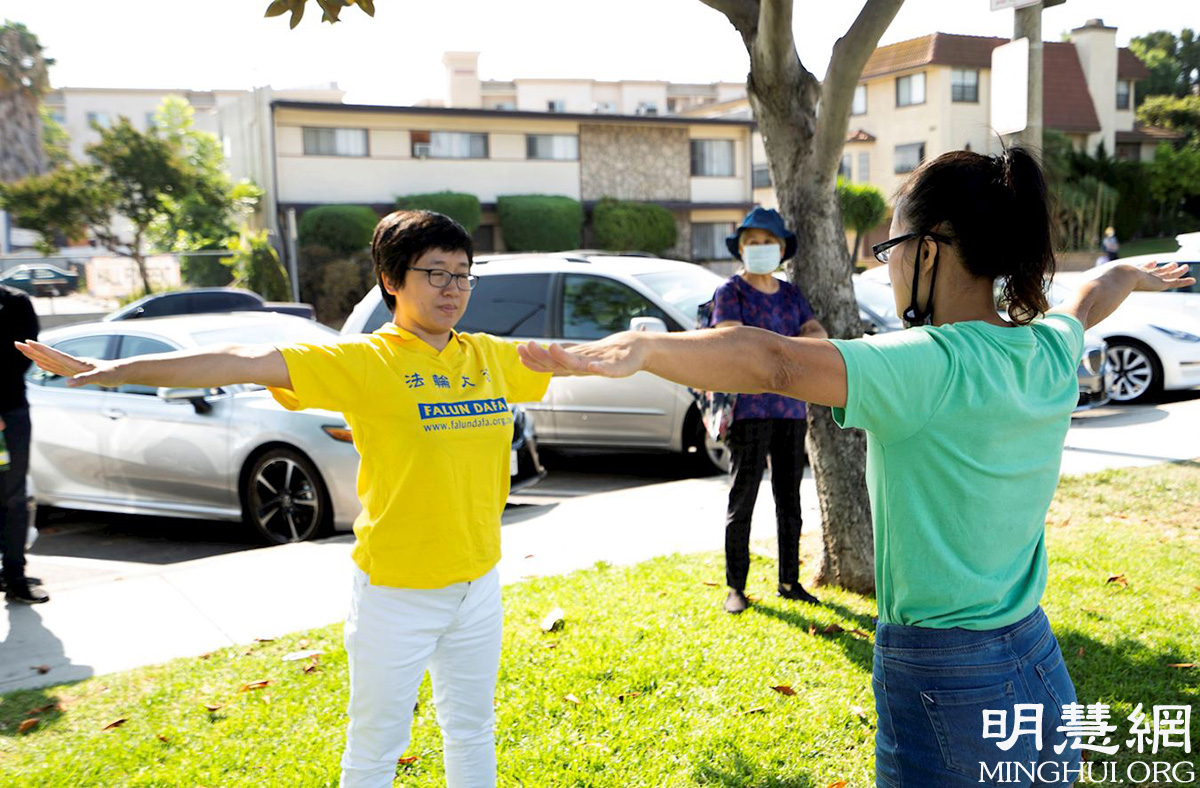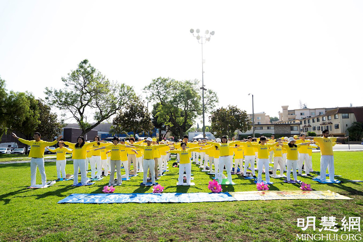 ![]() 图1:二零二一年七月十七日,洛杉矶部份法轮功学员在蒙特利公园市(Monterey Park)的巴恩斯公园(Barnes Park)集体炼功,纪念法轮功反迫害二十二周年。 |