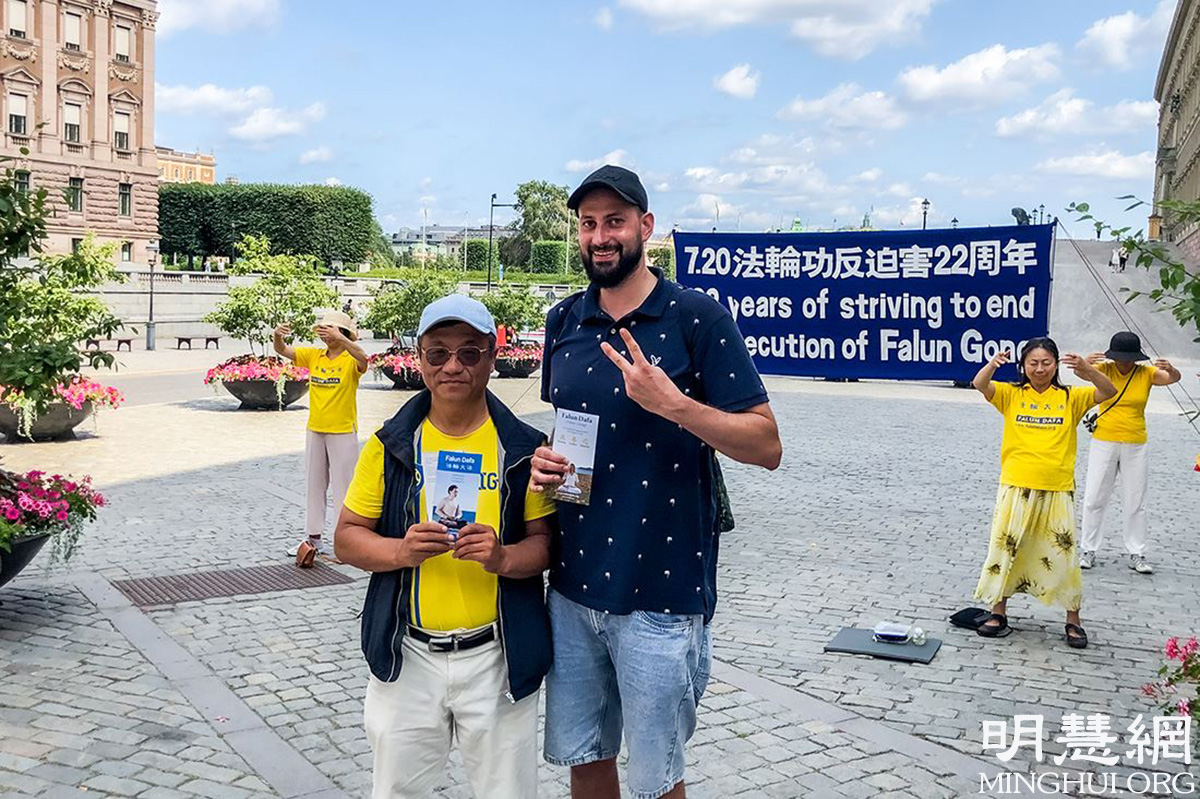 ![]() 图1:法轮功学员在斯德哥尔摩市中心国会大厦旁举办“法轮功反迫害二十二周年”讲真相活动。 |