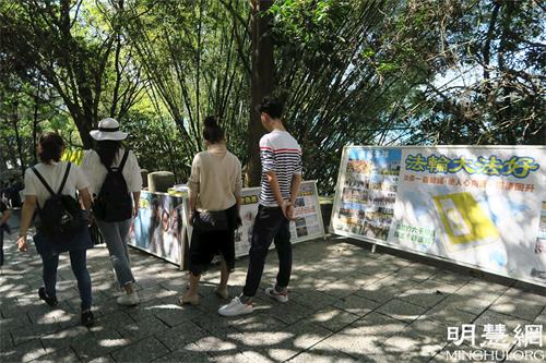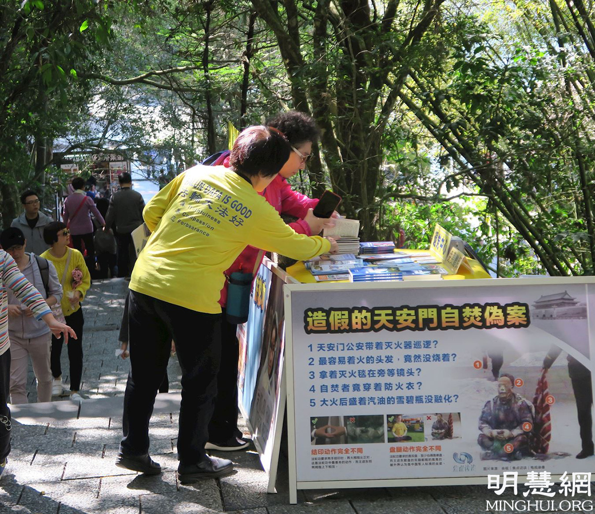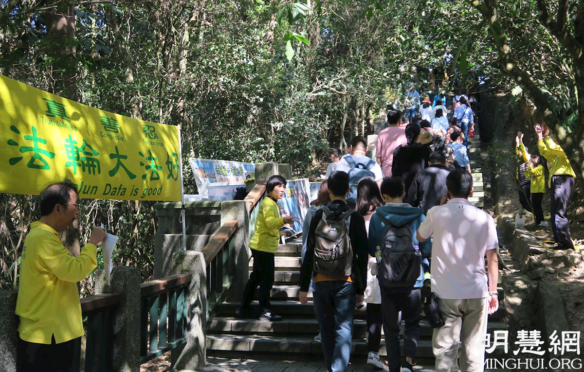![]() 图3~4:青龙步道上,大陆游客停下脚步,关注法轮功真相。 |