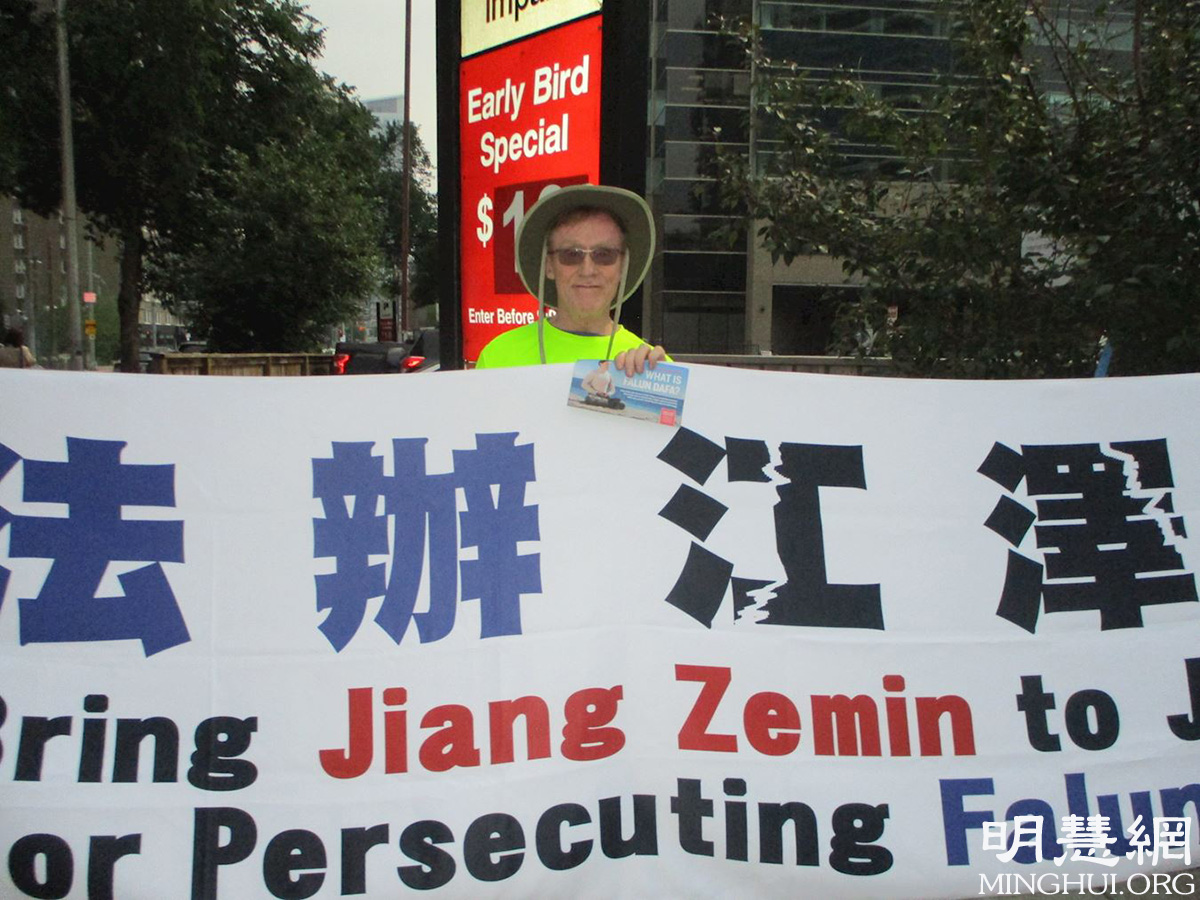 大卫·汤普森(David Thompson)曾在一家著名的石油公司任职,退休后住在紧邻中领馆的公寓里。他介绍,每次法轮功学员在中领馆前举办活动时,他都看个清楚,听个明白。7月19日当天,在法轮功学员的活动开始时,他主动加入拉横幅的行列。