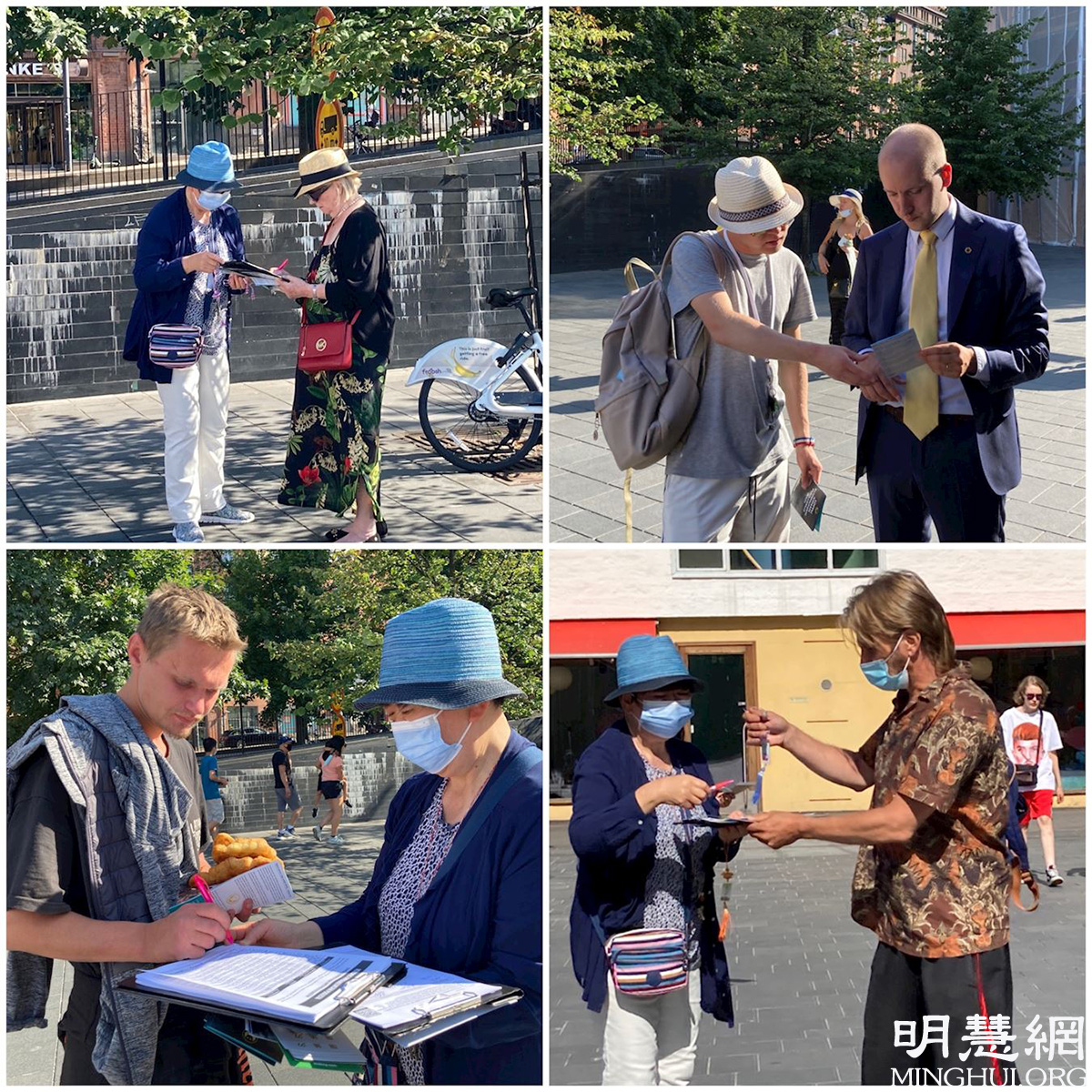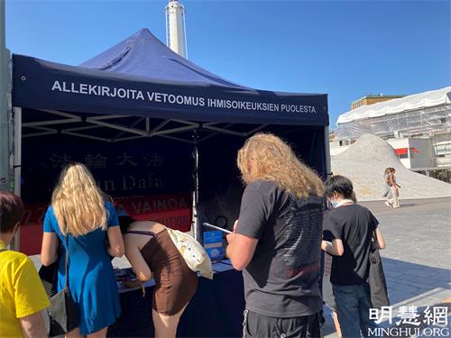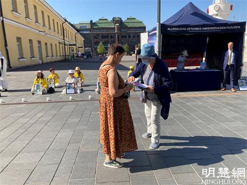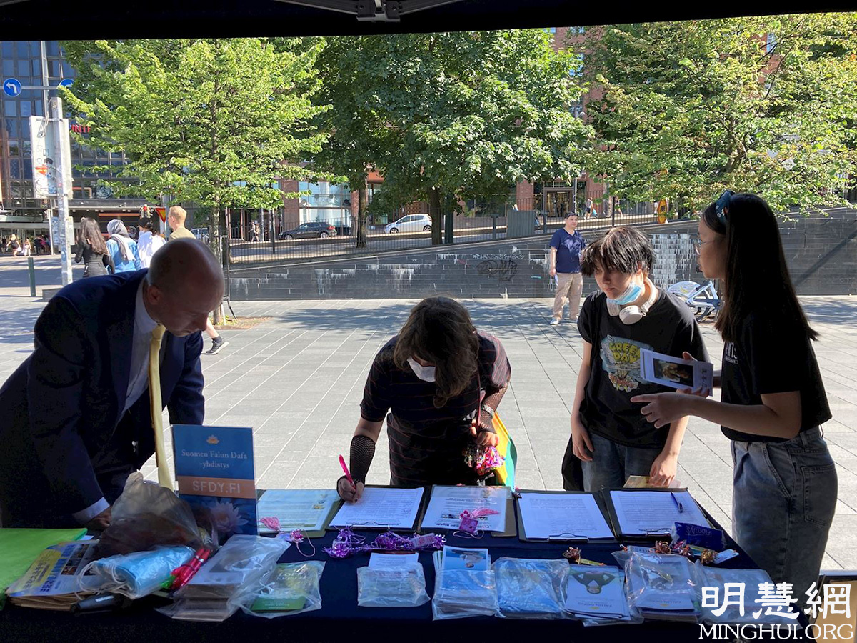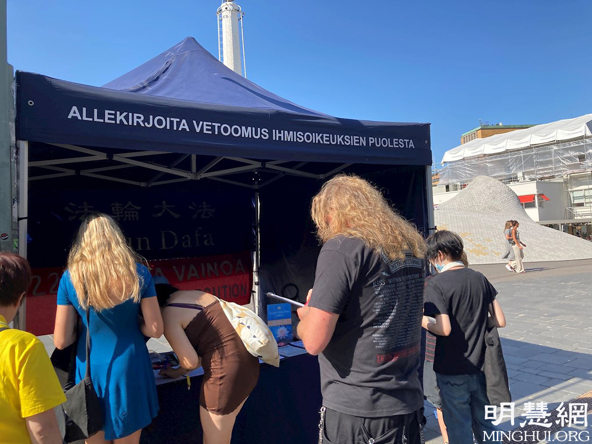 七月十七日星期六,学员在赫尔辛基甘比(Kamppi)购物中心广场,举行七二零反迫害集会,谴责中共暴行。部份学员捧着去世学员的遗像,伴随着弹奏的吉他曲子和葫芦丝悲伤的曲调,这种场景,吸引行人驻足观看,很多人前来了解情况,并在征签表上签名支持法轮功反迫害。