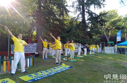 在绿茵茵的草地上,随着舒缓悦耳的炼功音乐,学员们开始展示法轮功的五套功法,吸引了不少行人驻足观看并前来了解真相。明白真相的民众们纷纷在“制止迫害,解体中共”的征签表上签字。