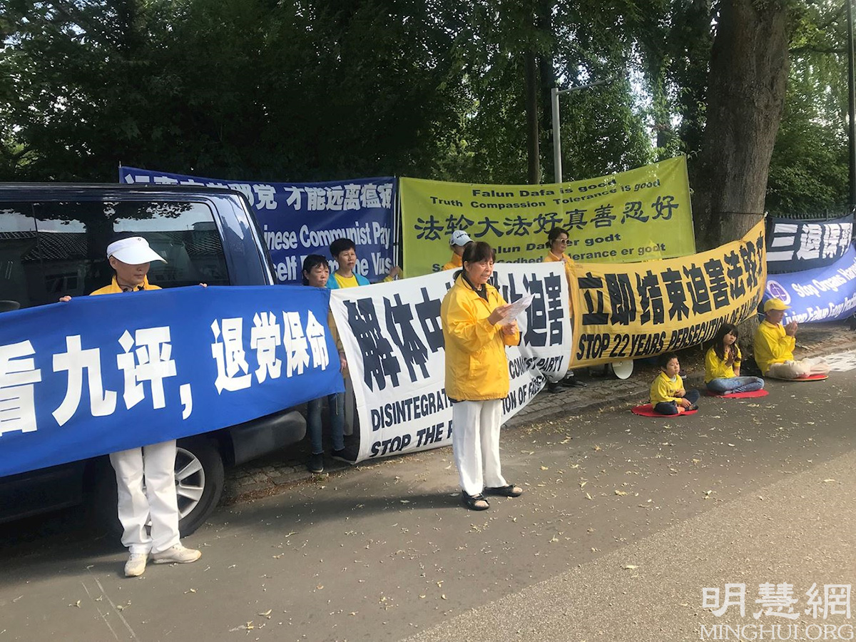 七月二十日上午法轮功学员在中共驻丹麦大使馆前集会,抗议中共自一九九九年七月至今,对法轮功信仰群体持续了二十二年的残酷迫害。