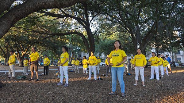 ![]() 图1:美国佛罗里达州法轮功学员在该州中部城市奥兰多举办了反迫害集会。图为集体炼功。 |