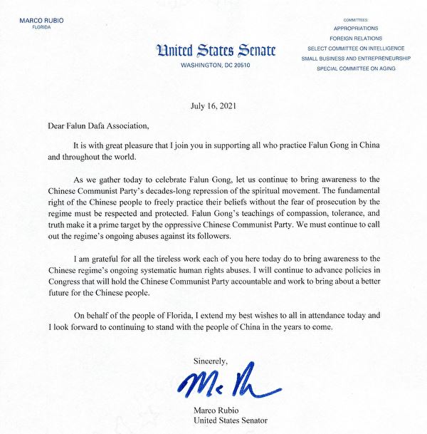 2021年7月16日,美国国会及行政部门中国问题委员会(Congressional-Executive Commission on China)主席,参议院情报委员会副主席马可·卢比奥(Marco Rubio)致信法轮大法学会,表示“将继续在国会推进政策,让中共承担责任”。