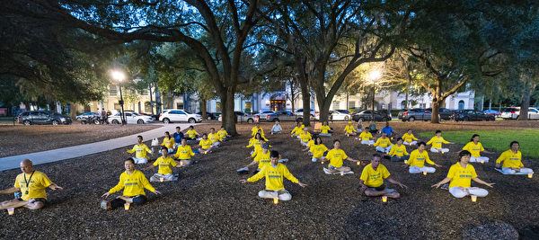 7月17日晚,学员们集体炼功,向过往路人展示法轮功功法的祥和美好。路人纷纷驻足观看,并向学员们了解法轮功受迫害的真相。